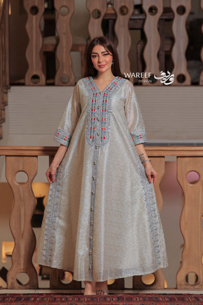 القصة والتصميم لجلابية بيج بتطريز فضي وأحمر