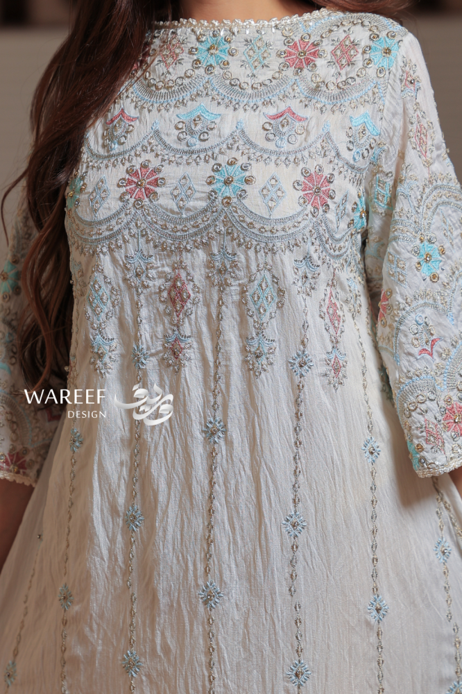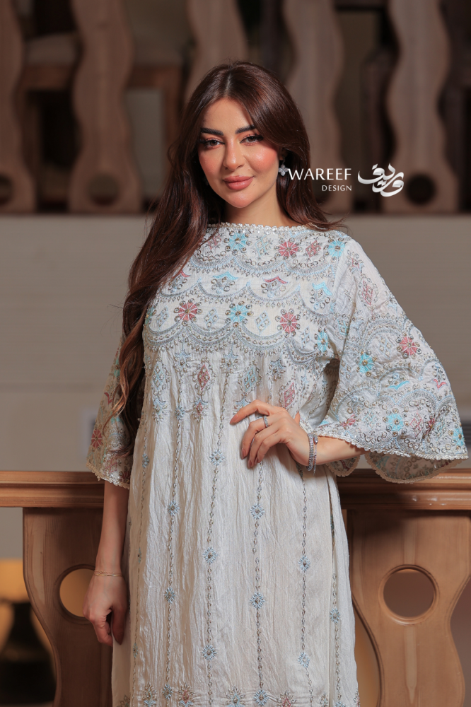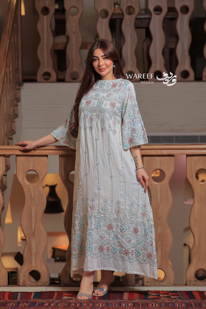 استوحي أناقتك من التراث مع جلابية بيضاء بطابع تراثي وتطريز ناعم بألوان هادئة. اللون الأبيض العاجي يمنح حضوراً نقياً راقياً، فيما تضيف لمسات التطريز اليدوي بألوان الأزرق والوردي والرمادي جمالاً فنياً يجمع بين الأصالة والحداثة. تصميم مريح وانسيابي يجعلها الخيار المثالي للإطلالات الرمضانية والمناسبات الخاصة