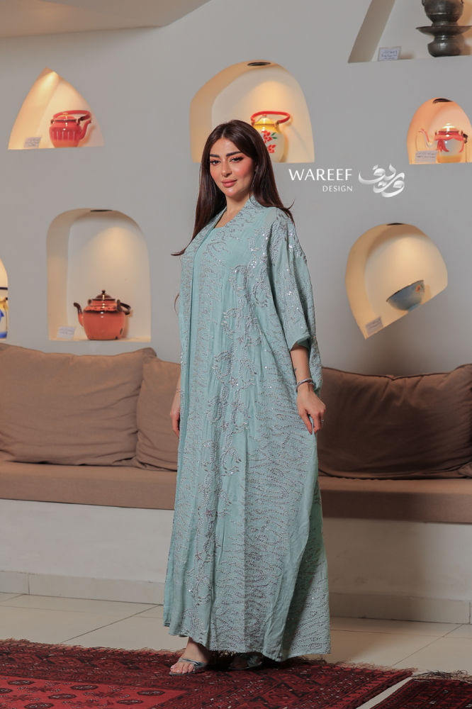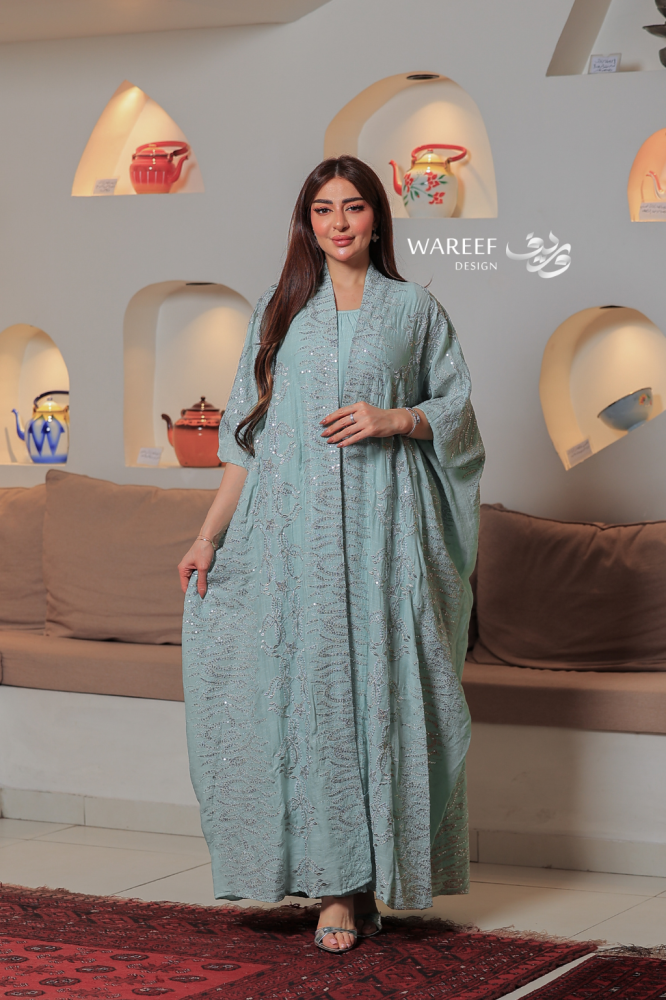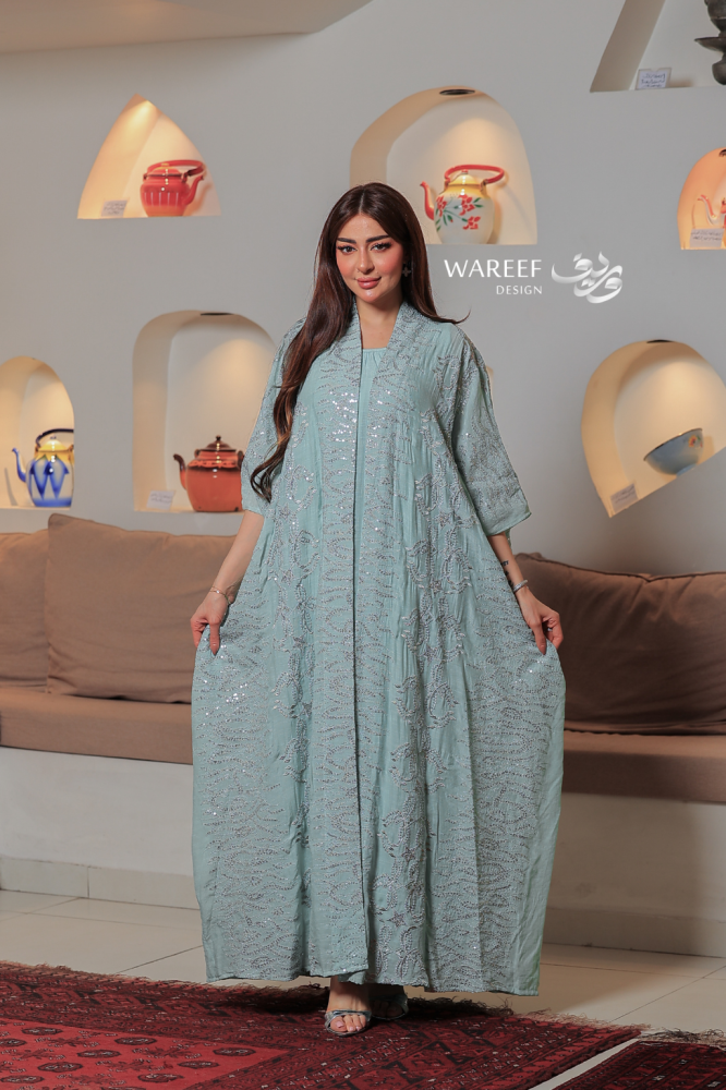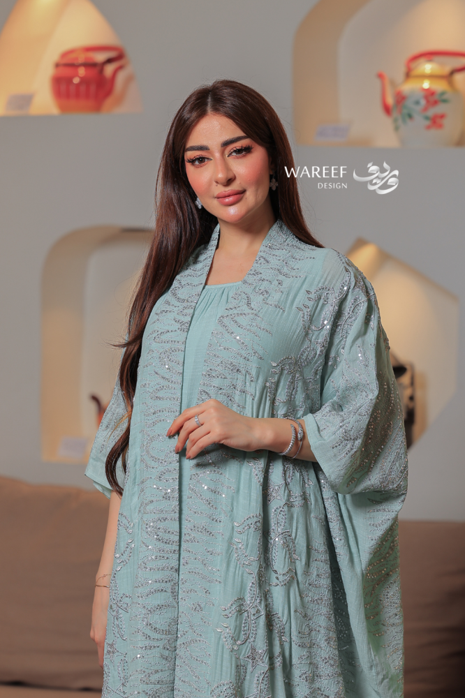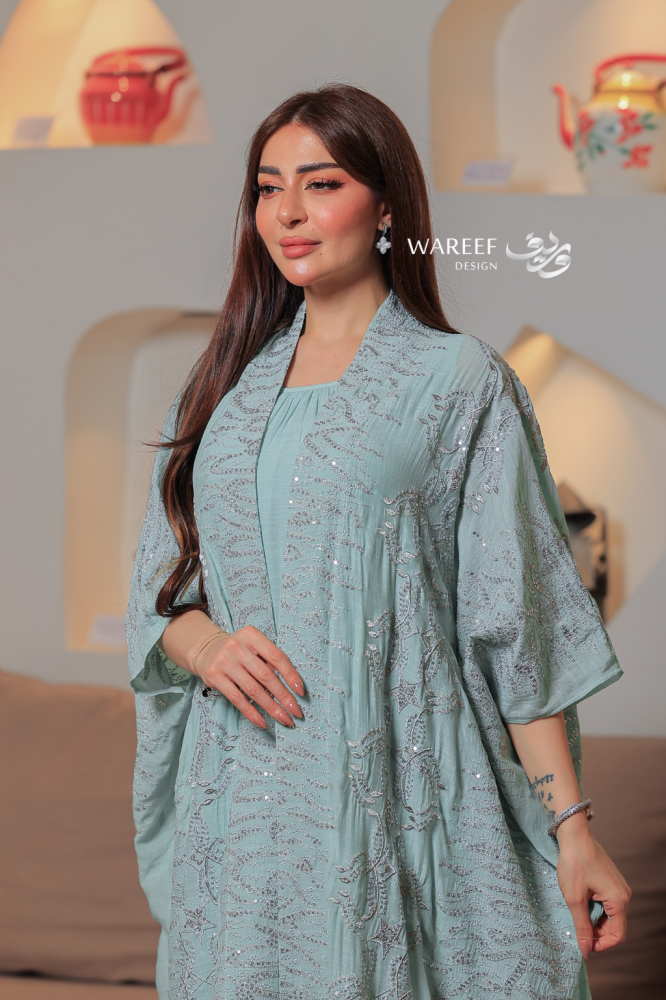 جلابية سماوية مطرزة قطعتين بتصميم واسع وانسيابي أنيق