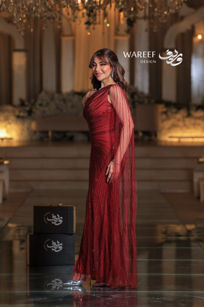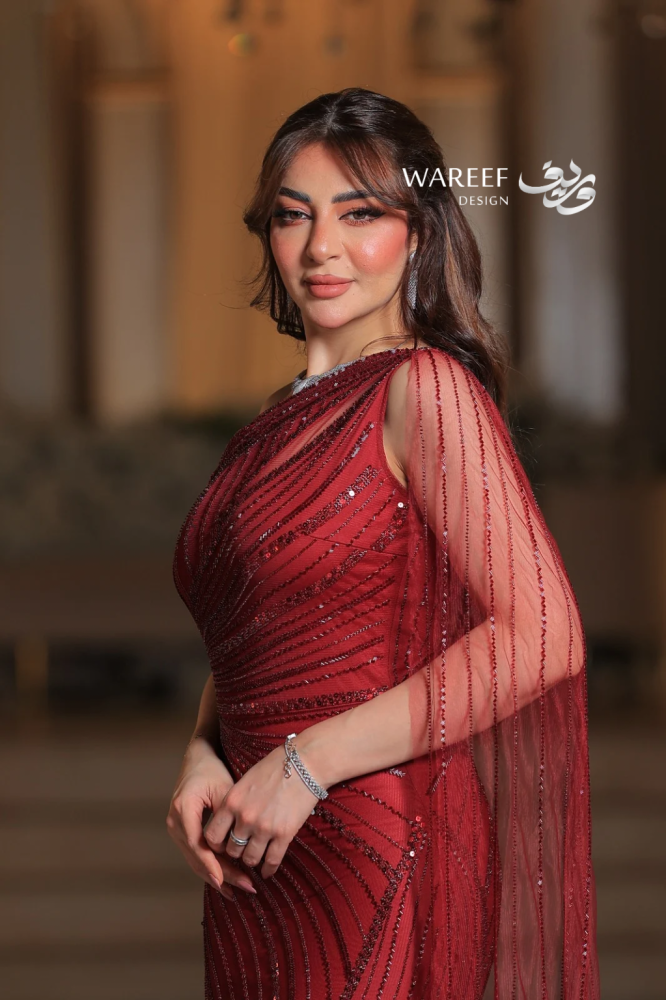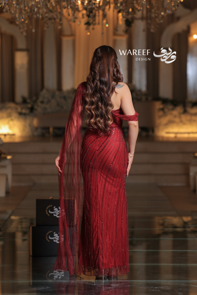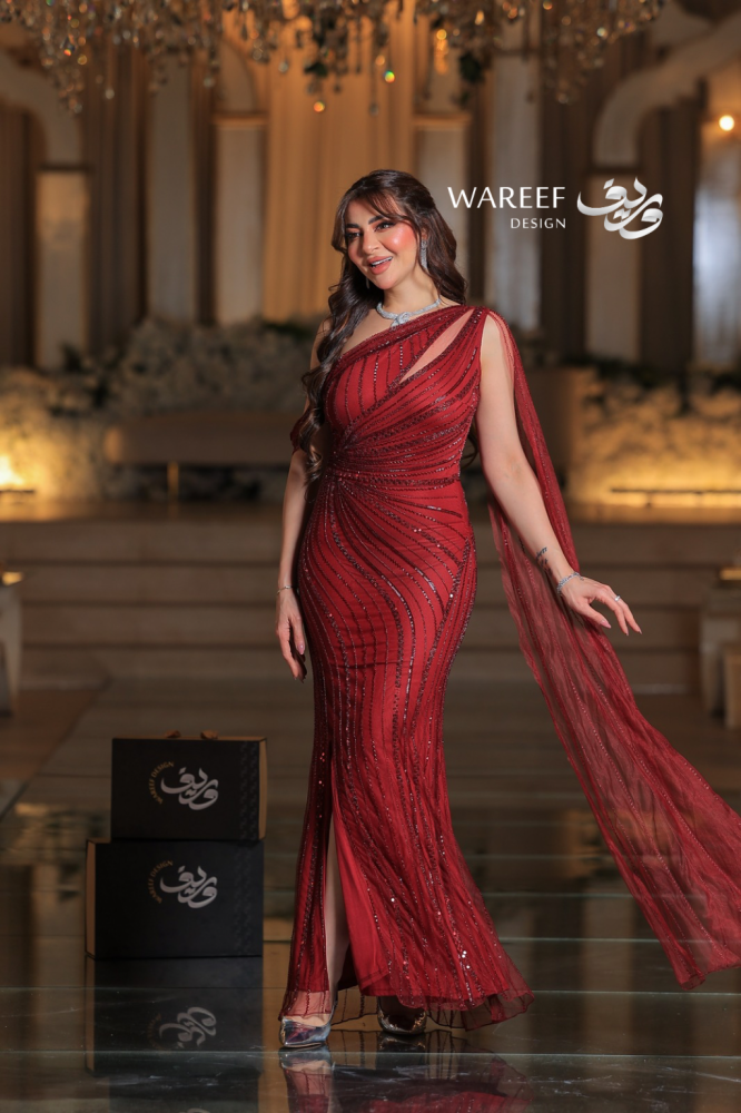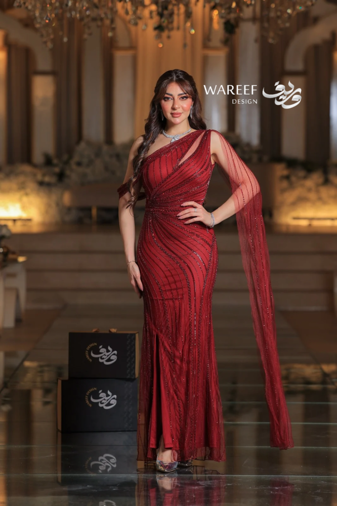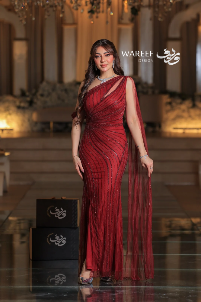 تألقي بإطلالة جريئة وملكية مع فستان أحمر بتطريز لامع وقماش شفاف. اللون الأحمر العميق يعكس القوة والأنوثة، بينما يمنحك الجناح الجانبي الطويل حضوراً آسراً لا مثيل له. تصميم ضيق بالكامل بخامة تل مطرز فاخر يبرز جمال القوام ويجعلك محط الأنظار في كل مناسبة راقية.