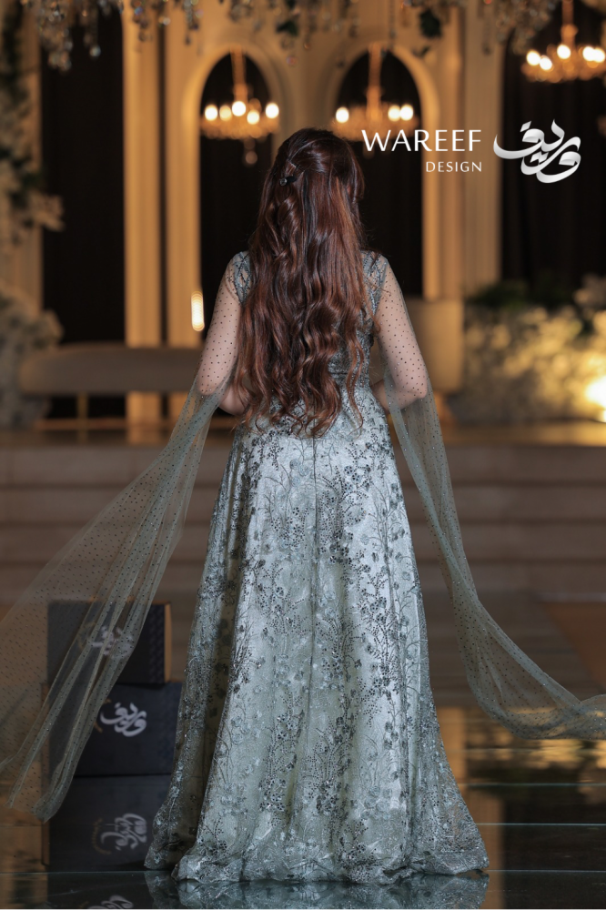 - الأكمام الحالمة: سر جاذبية الفستان يكمن في الأكمام الطويلة الشفافة، والتي تبدو وكأنها وشاح من الضباب، مزينة بنفس التطريز الفضي اللامع الذي يمتد على كامل الفستان، مضيفةً لمسة من الغموض والرومانسية.