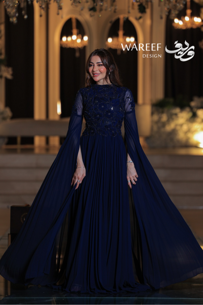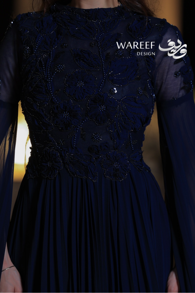 - القصة والتصميم: يتميز هذا الفستان الأزرق الطويل بتصميم ضيق عند الصدر ثم ينسدل ويتسع تدريجياً من الأسفل، مما يضيف لمسة من الأناقة والأنوثة. تكتمل روعة التصميم بأكمام طويلة شفافة مزخرفة بالكامل بتطريز فاخر يمتد على طول الذراعين.