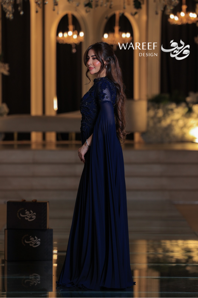 - اللون والقماش: لون أزرق ملكي غني وجذاب، مصنوع من قماش ناعم ومريح ينساب على الجسم بأناقة. الفستان مزين بتطريزات براقة وفاخرة بالخرز واللمعان تضفي عليه بريقاً رائعاً.