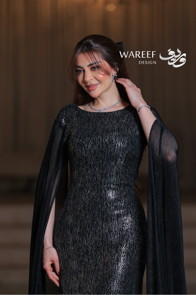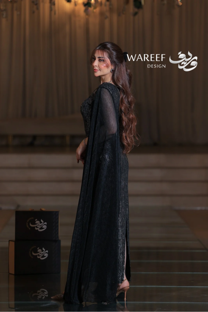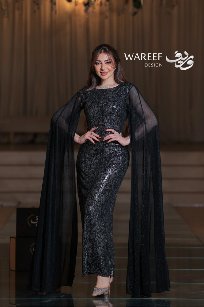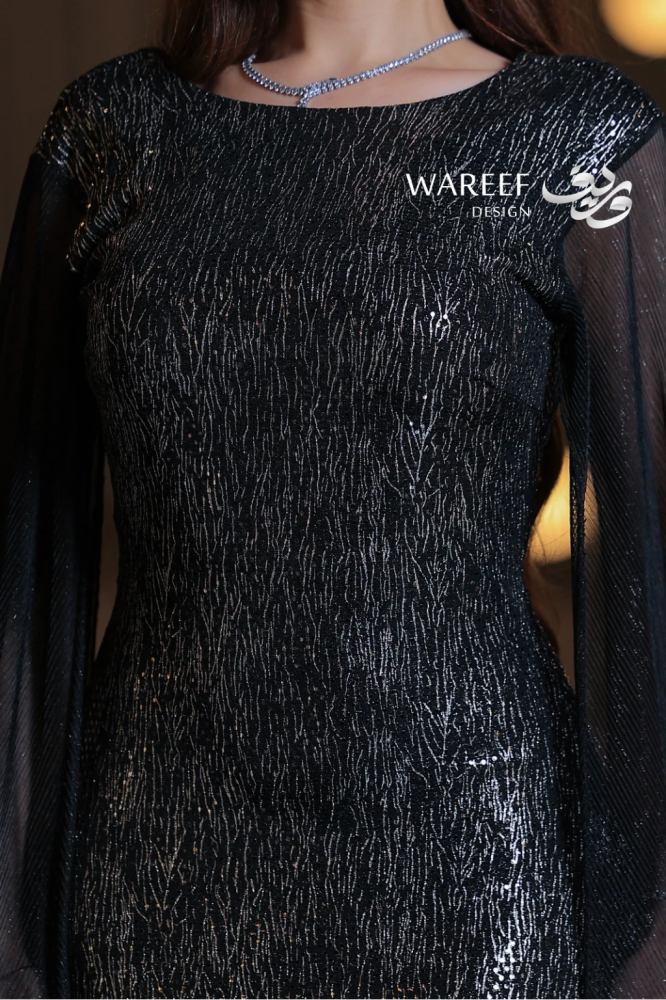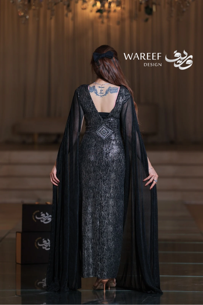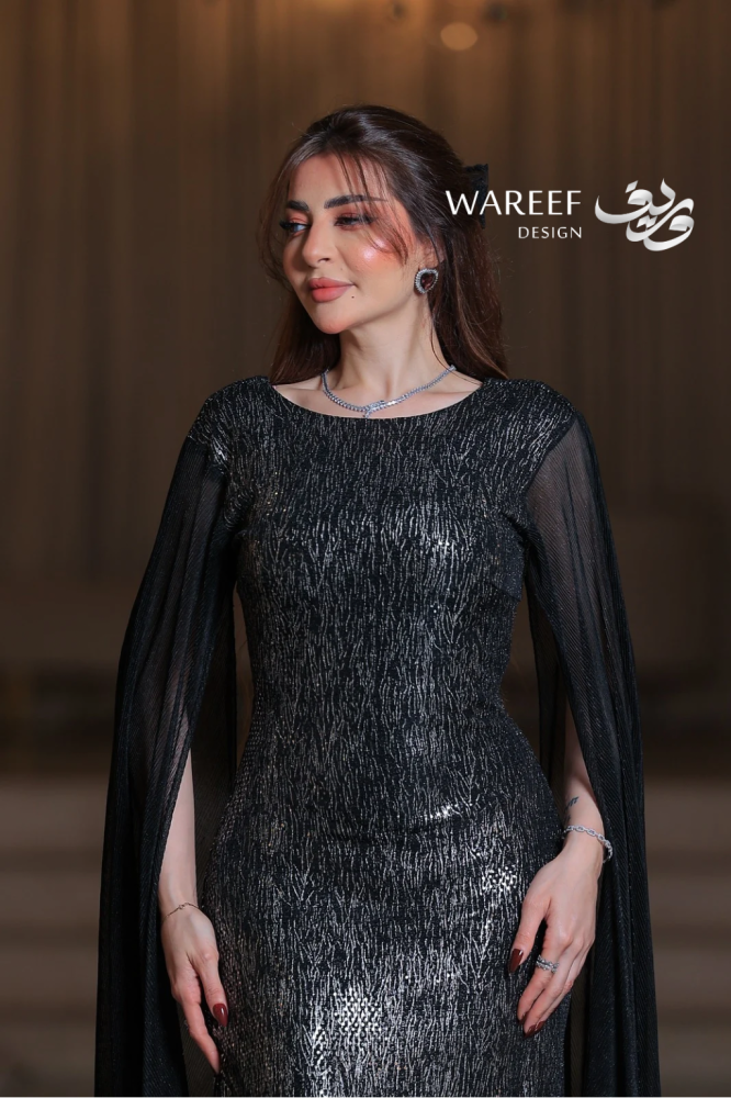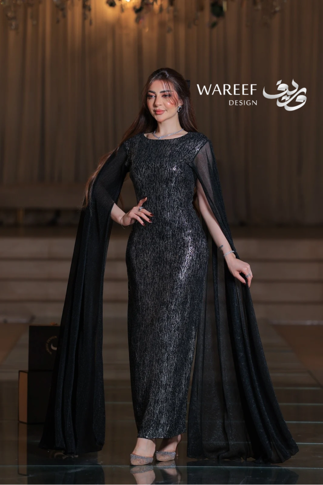 - اللون والتصميم: أسود معدني أنيق مع لمعة فضية متداخلة تمنحه بريقاً جذاباً. يتميز بقصته الانسيابية التي قد تبدو كفستان أسود ضيق يبرز جمال القوام، مع لمسة ملكية فريدة من خلال أكمام كاب طويلة وشفافة تنسدل برشاقة.