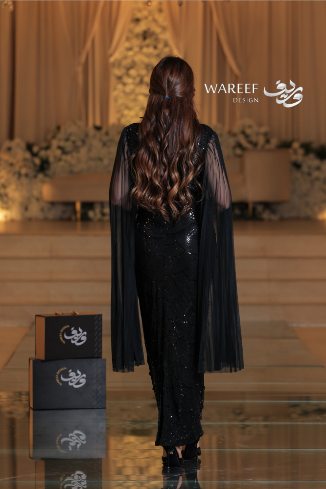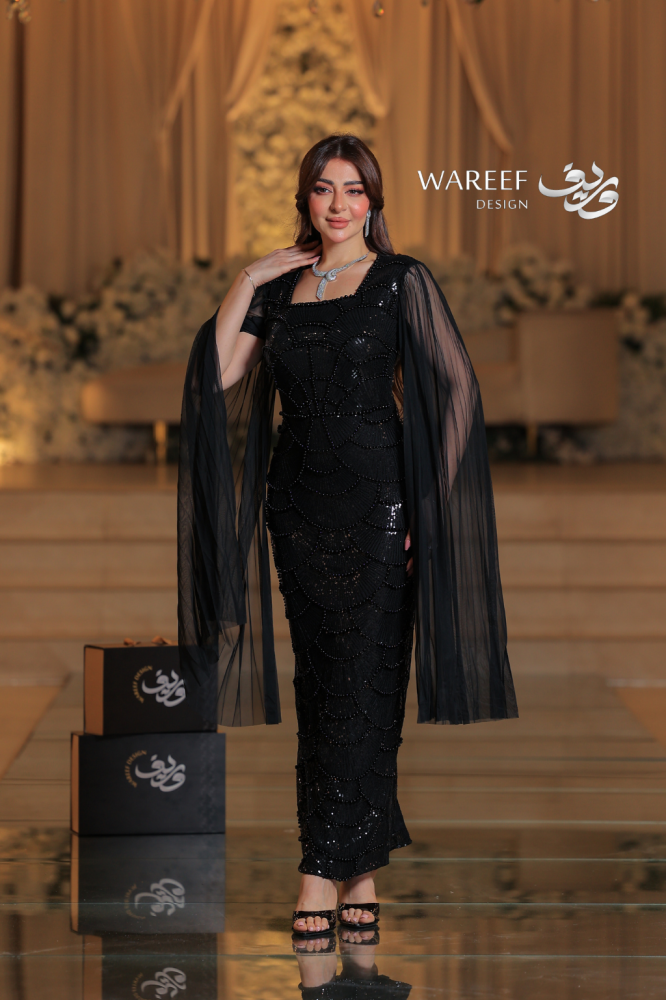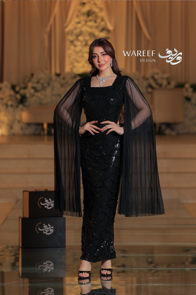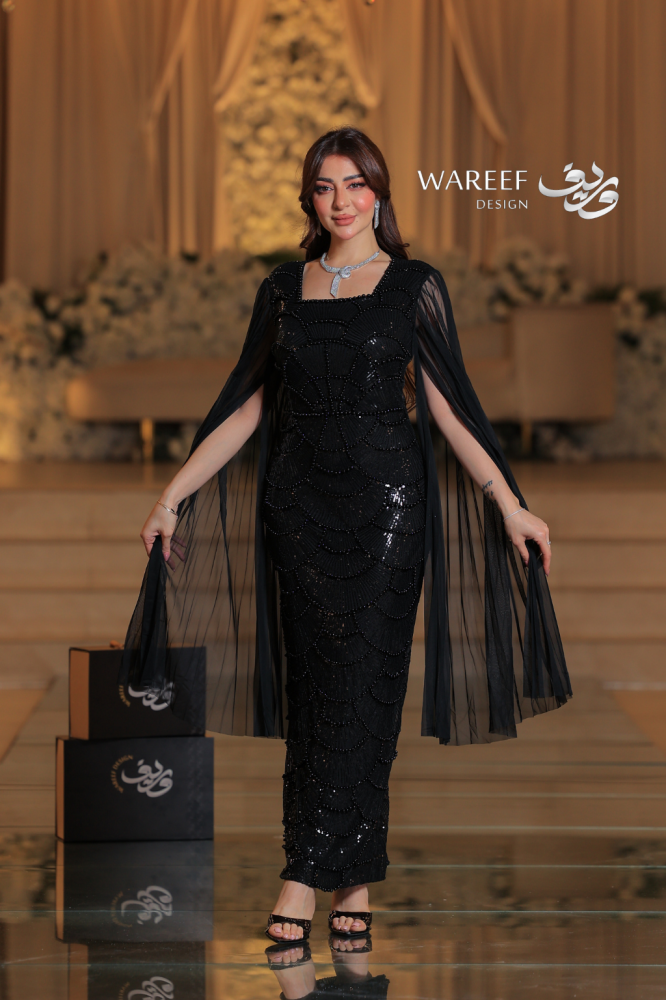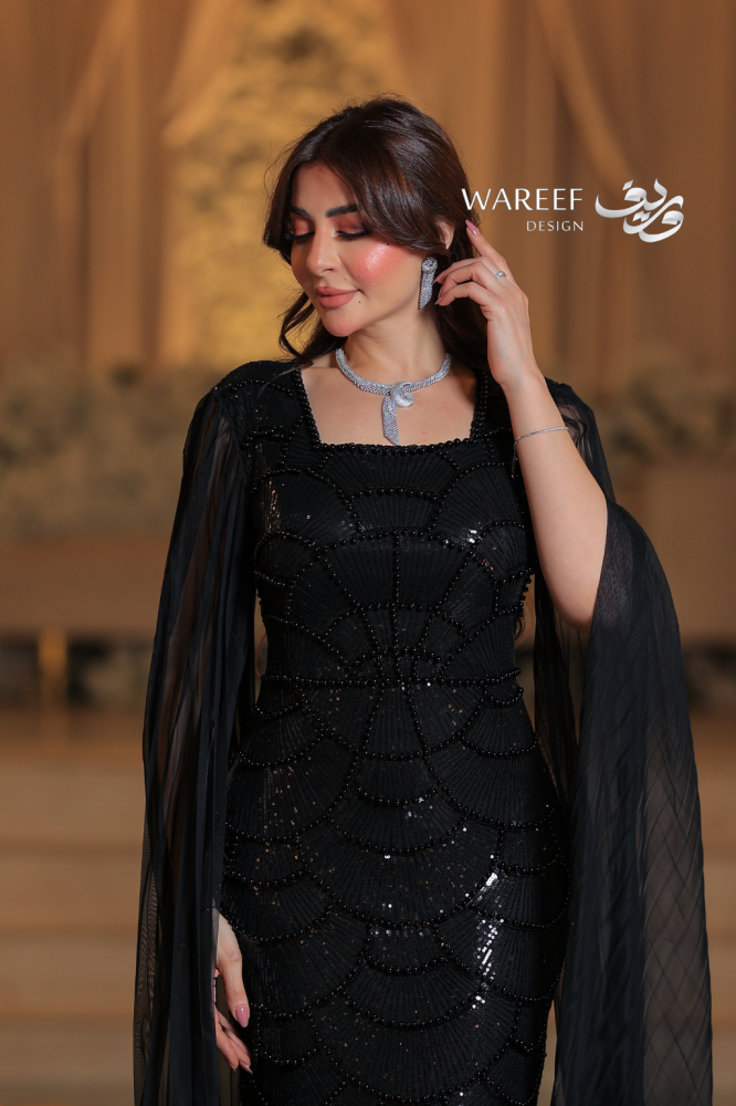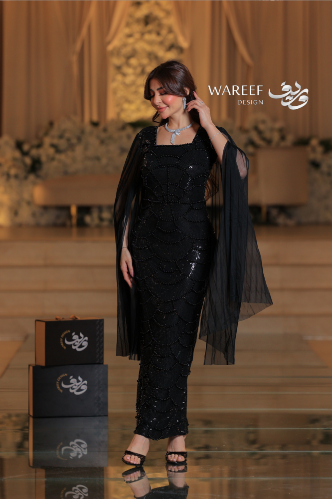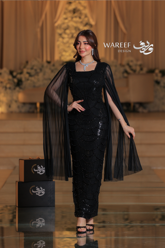 قصة ضيقة مستقيمة (Sheath cut) تُبرز جمال القوام برقة وأناقة، مع ياقة مربعة تضيف لمسة كلاسيكية. الأكمام الطويلة المنسدلة من الأكتاف بتصميم الكاب الشفاف تضيف انسيابية أنيقة ولمسة غموض راقي. الزخارف المطرزة على شكل أقواس هندسية تعكس الضوء بطريقة جذابة تضفي عمقًا ولمعانًا راقيًا.
