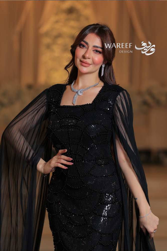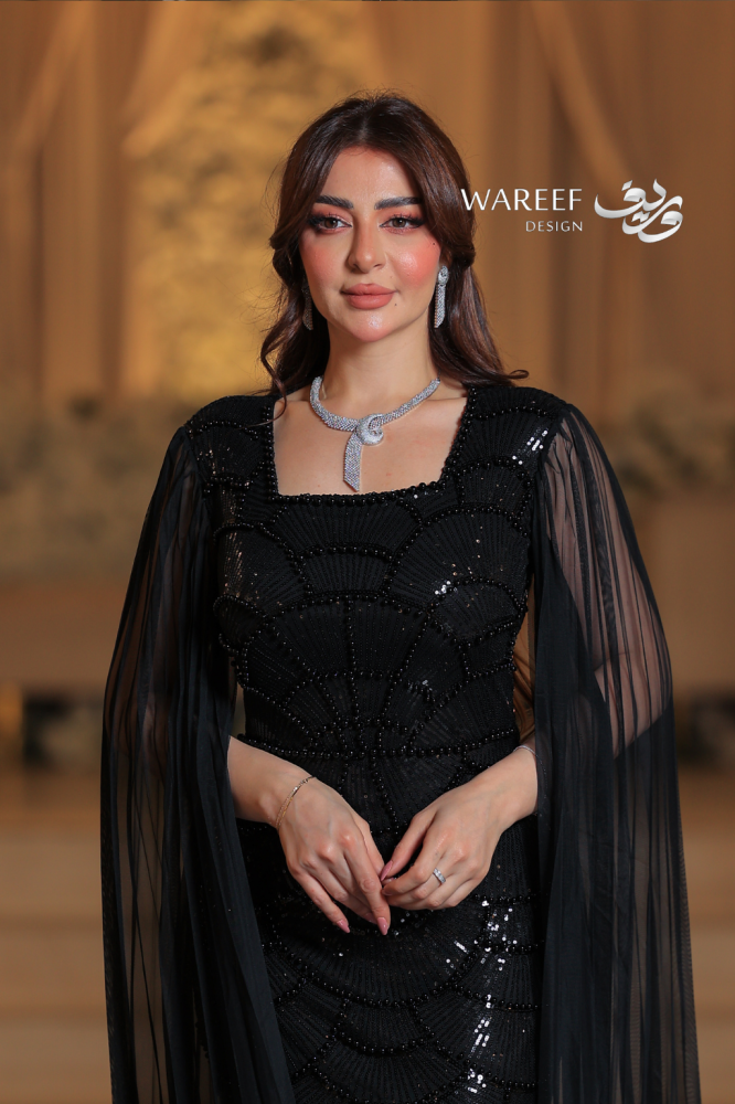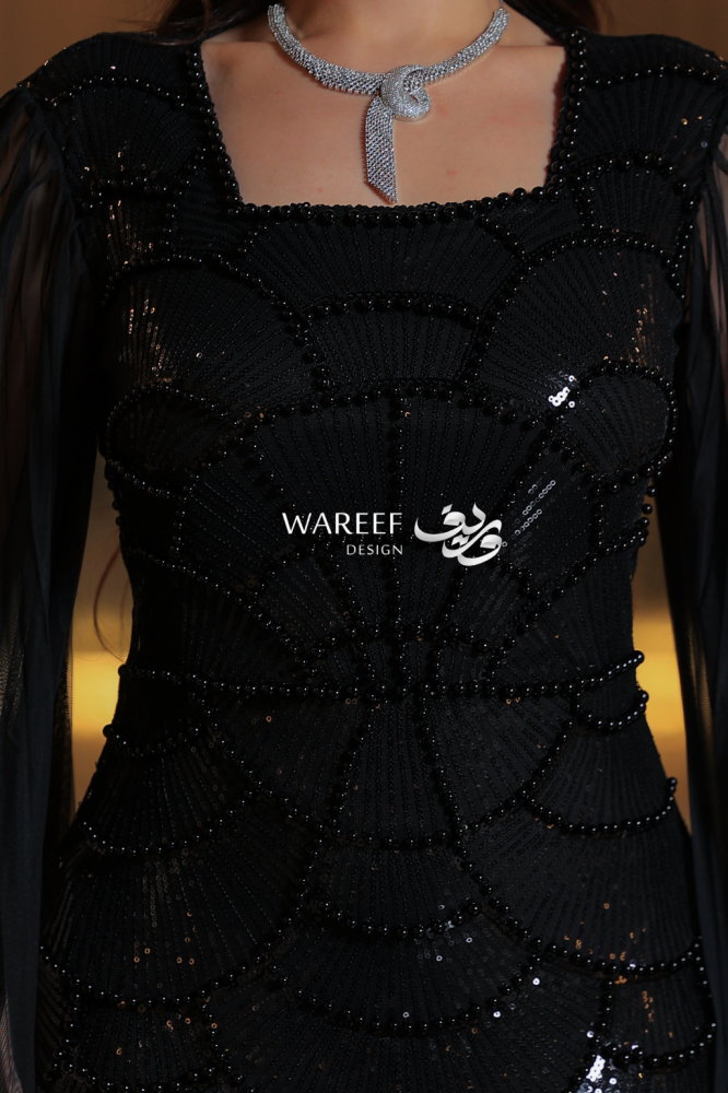 مصنوع من قماش التل المطرز بالترتر الأسود اللامع ، مع أكمام من الشيفون الحريري الشفاف تنساب بخفة لتعطي لمسة درامية ساحرة.