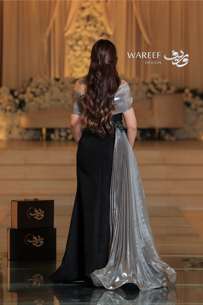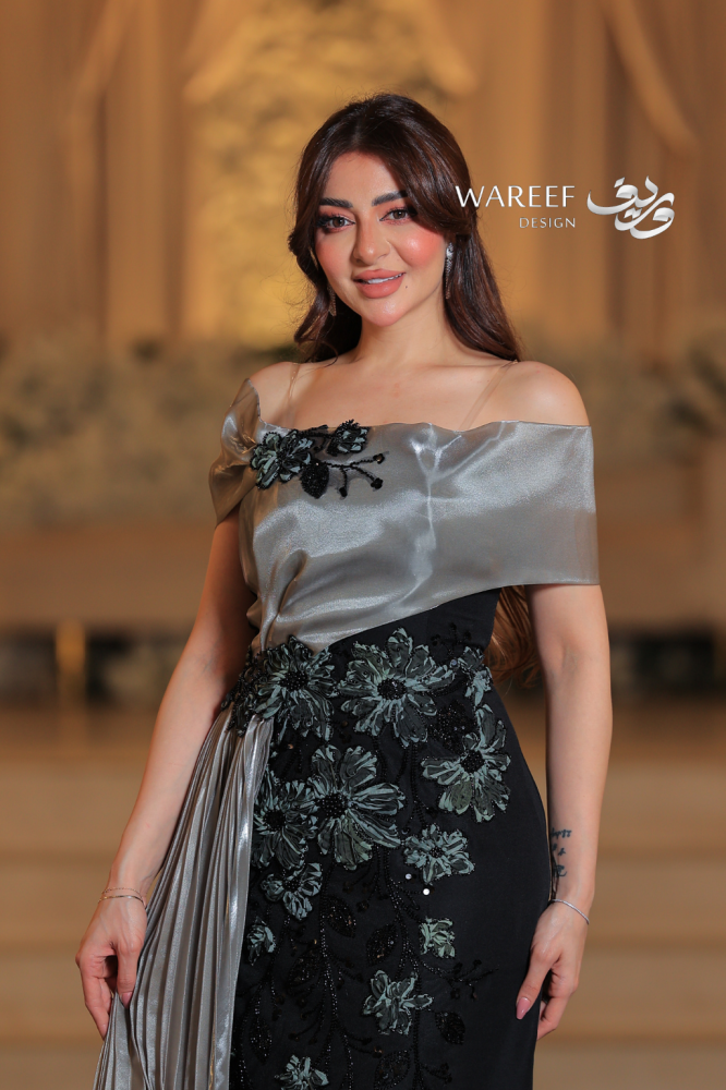 أما الجزء العلوي والشال الجانبي فمن قماش ميتالك فضي بملمس حريري لامع يعكس الضوء برقي دون مبالغة.