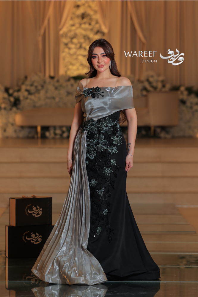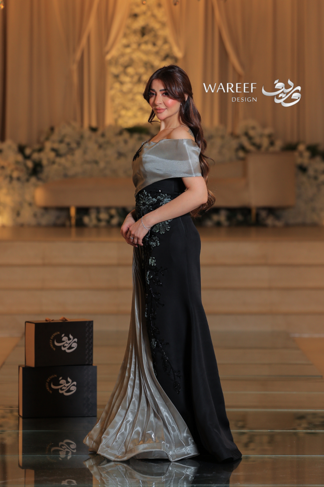 يتميز بكتف مكشوف "أوف شولدر" مصنوع من قماش لامع فاخر ينسدل على الكتفين بخطوط ناعمة تضيف فخامة ملكية.
