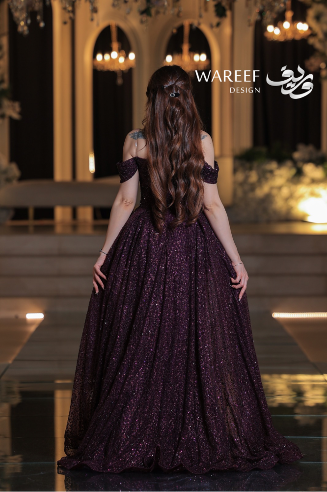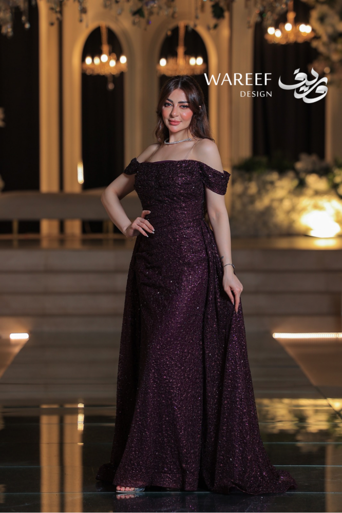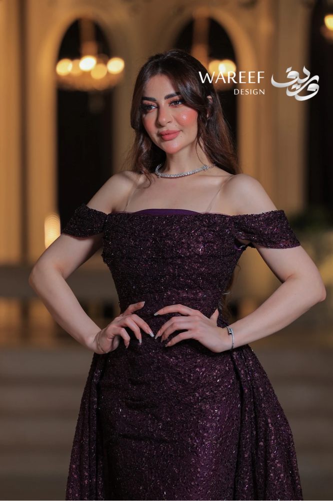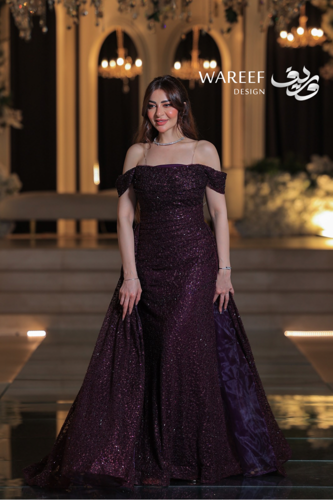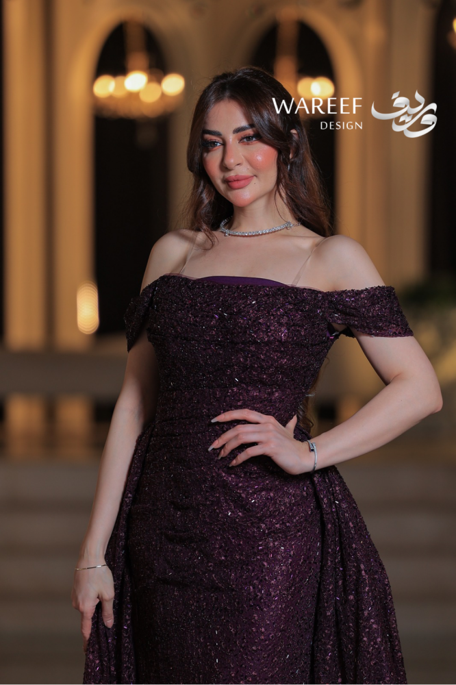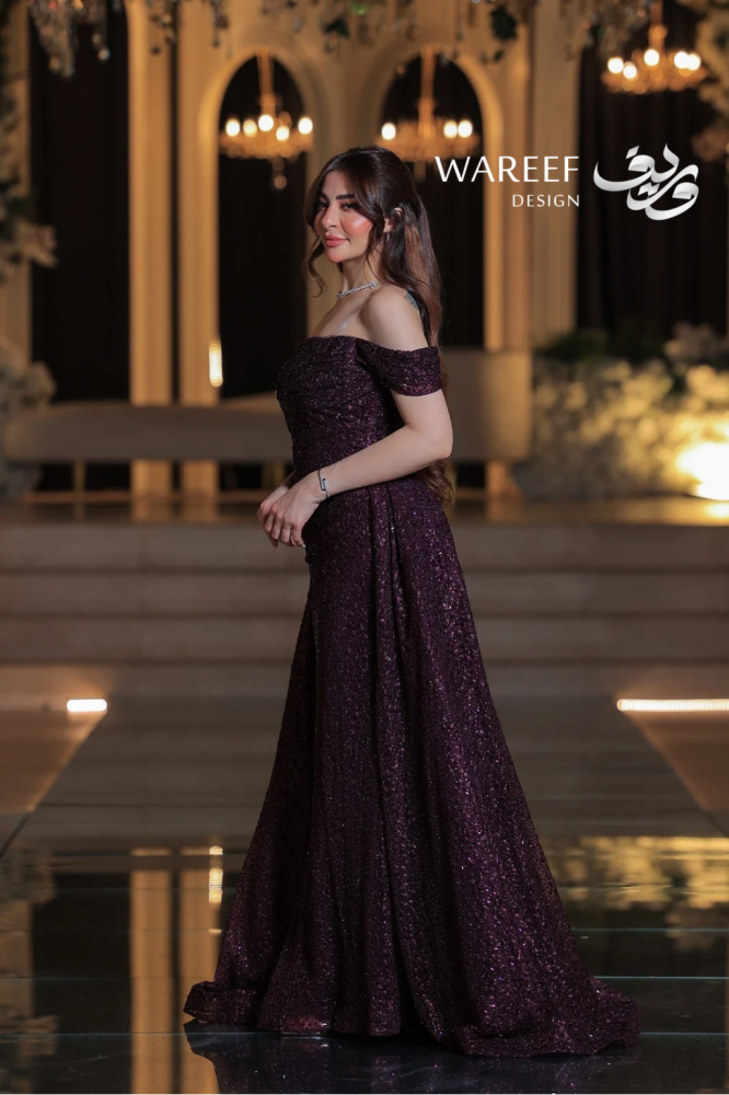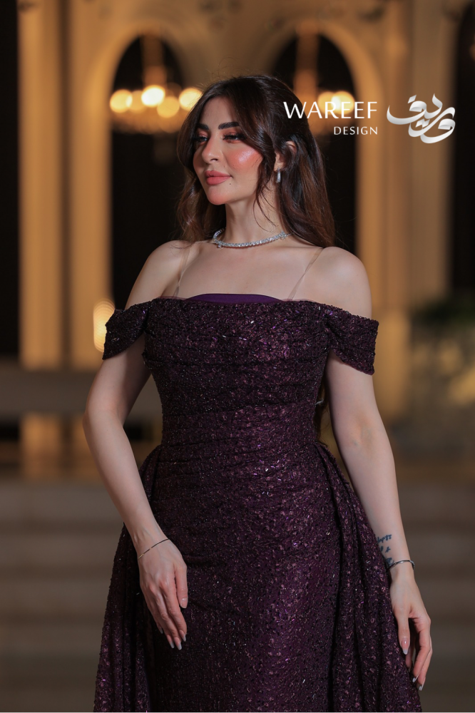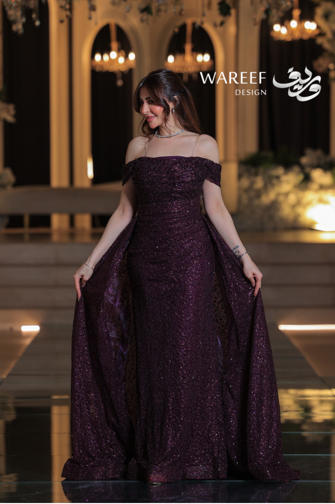 - اللون والقماش: لون بنفسجي بوردو غني وعميق، مصنوع من قماش لامع يتلألأ مع حركة الضوء. الفستان مزين بالكامل بتطريزات متقنة من الخرز اللامع، مما يضفي عليه بريقاً رائعاً وفخامة لا مثيل لها.