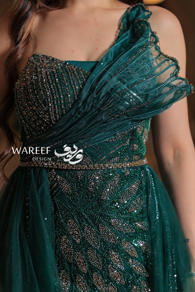 • الشعر والمكياج: تسريحة شعر مرفوعة أو مموجة مع مكياج ذهبي–أخضر متناسق.