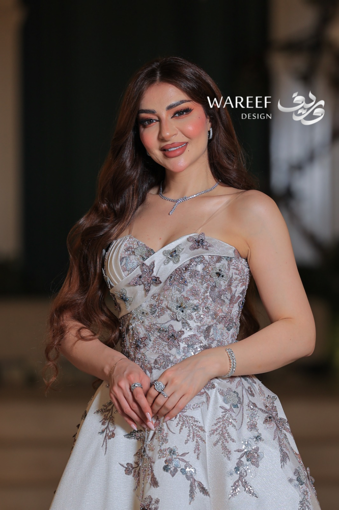 • تسريحة الشعر: مموجة ناعمة أو مرفوعة أنيقة لإبراز تفاصيل الكورسيه.