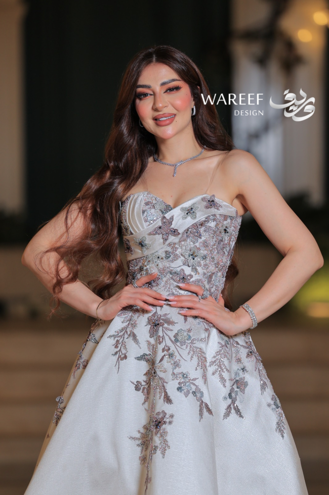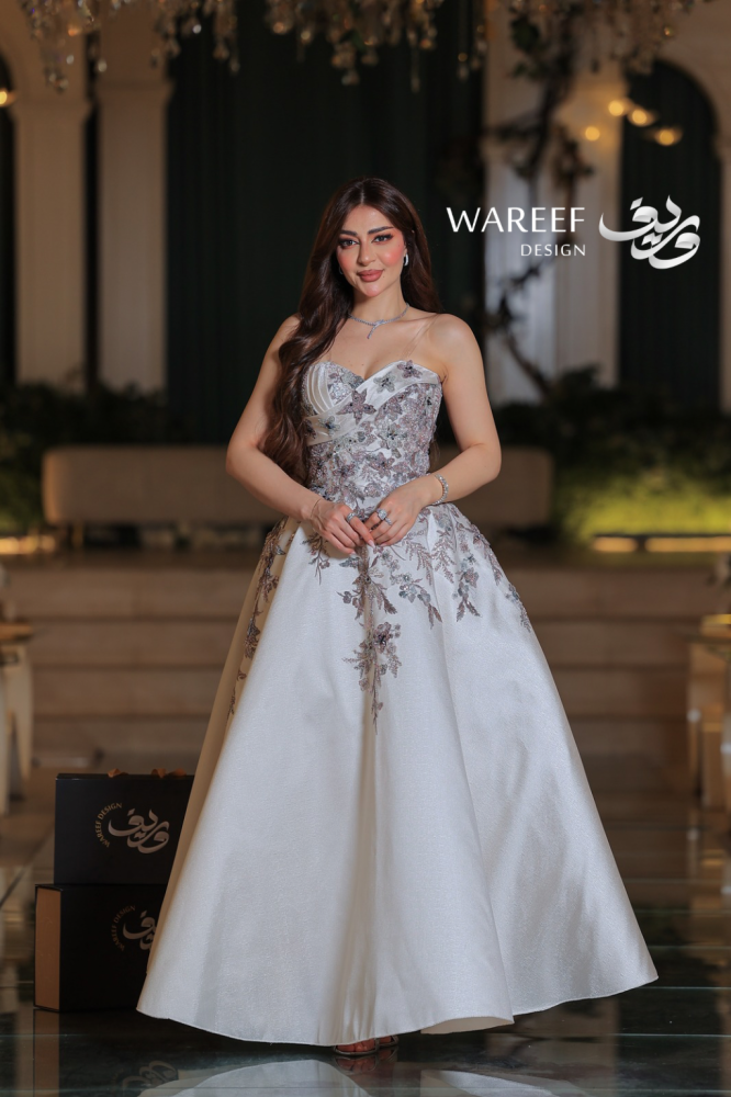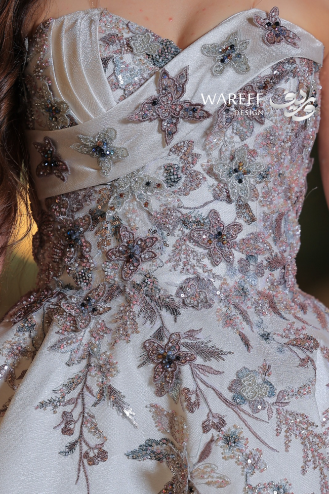 الفستان مصمم بقصة كلوش واسعة من الأسفل تعطي انسيابية وأناقة في الحركة. الكورسيه المطرز يدوياً بزهور متداخلة يمنح الفستان مظهراً فاخراً، فيما تسمح الربطات الخلفية بتعديل المقاس لتثبيت الكورسيه وإبراز جمال القوام بأسلوب أنثوي مميز.