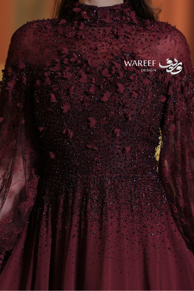 - الأكمام: شيفون ناعم شفاف مطرز بخيوط دقيقة متناسقة مع التصميم العام.