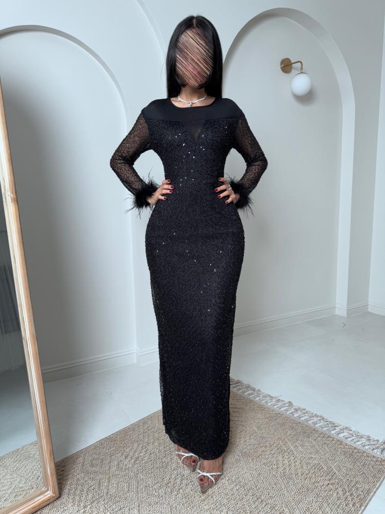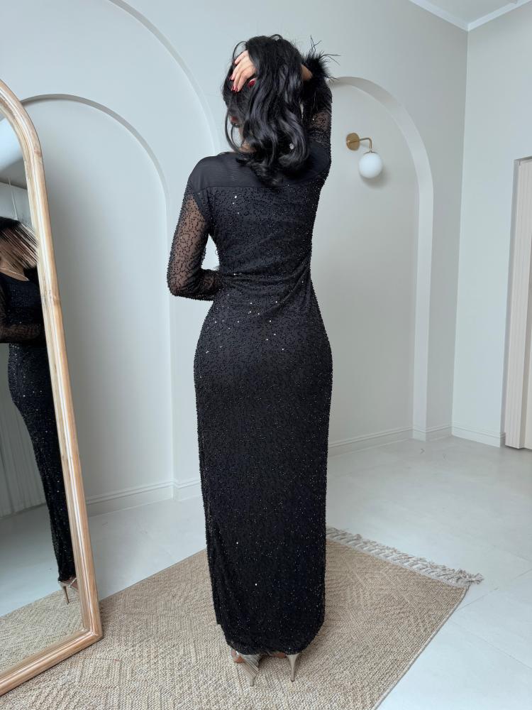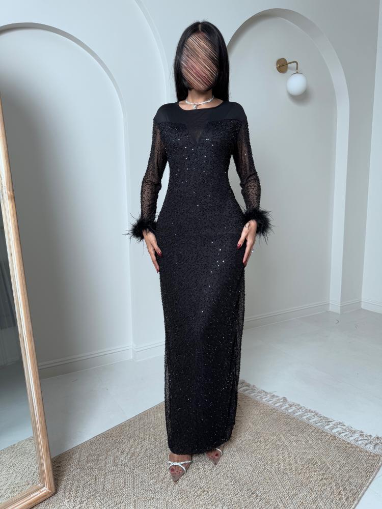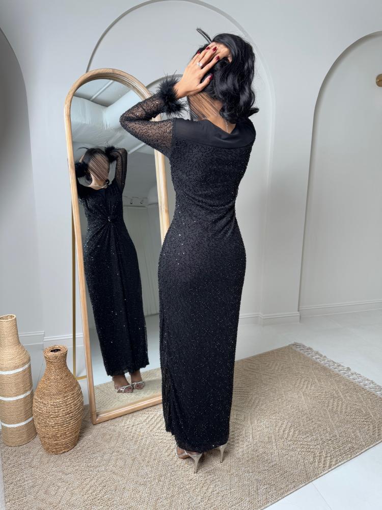 فستان سهرة أسود مزين بخرز تطريز يدوي