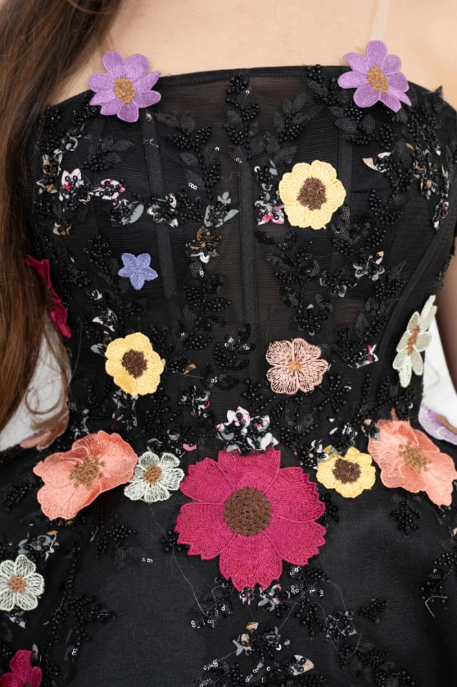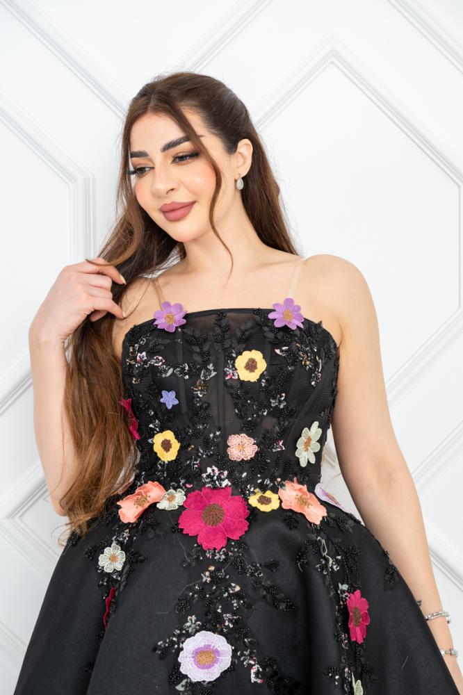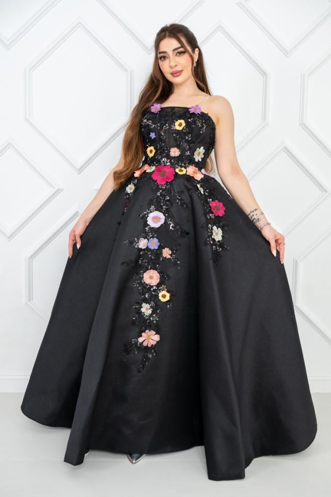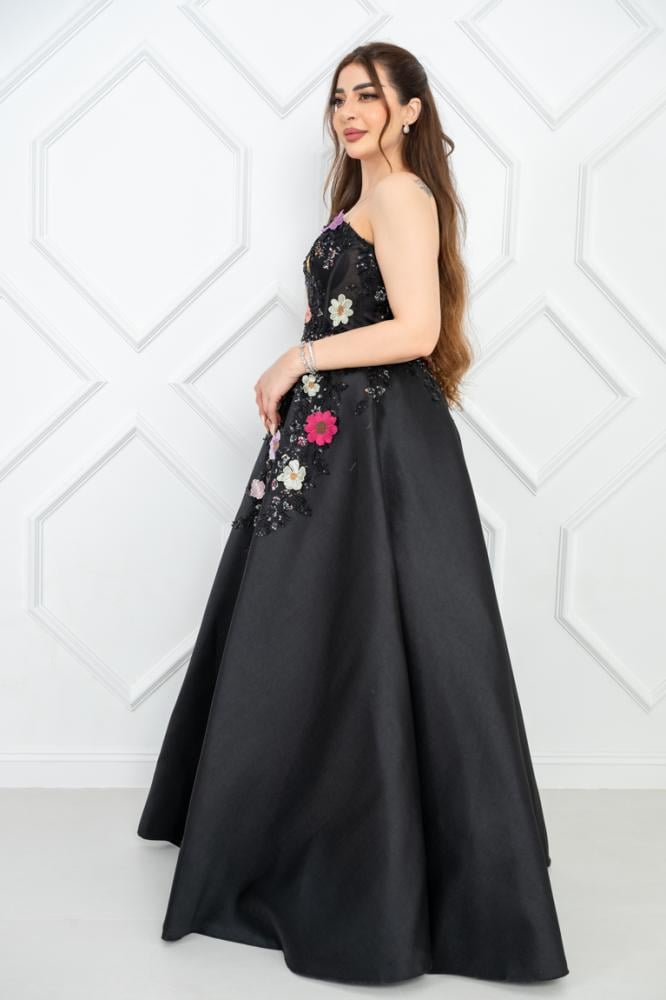 تزين الفستان بتفاصيل رائعة من الورود، حيث قد تكون هذه الزهور مطرزة بألوان دافئة أو منقوشة على القماش، مما يضفي لمسة من الحيوية والأنوثة. الورود قد تكون موجودة على منطقة الصدر أو تمتد بشكل جميل على طول الفستان، مما يخلق توازنًا رائعًا بين البساطة والتفاصيل.
