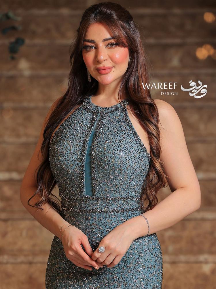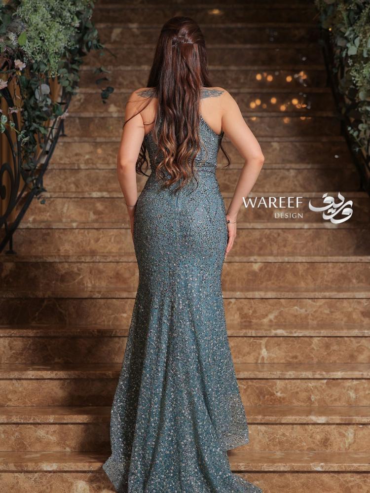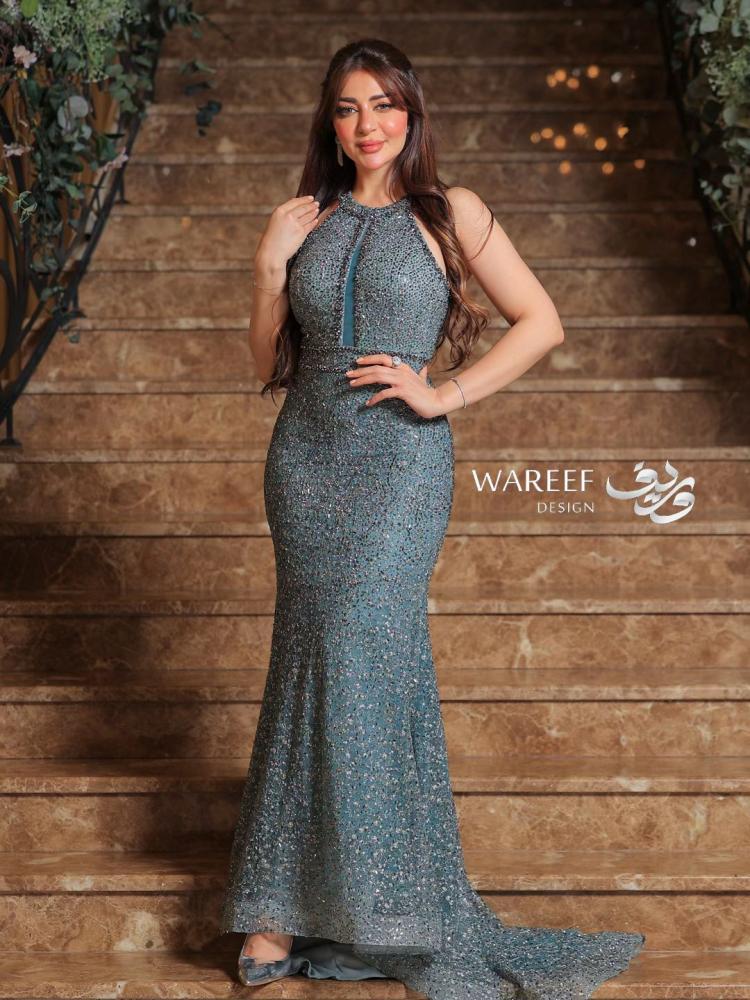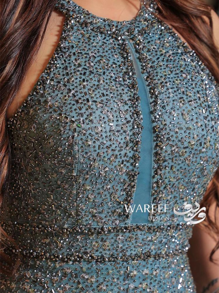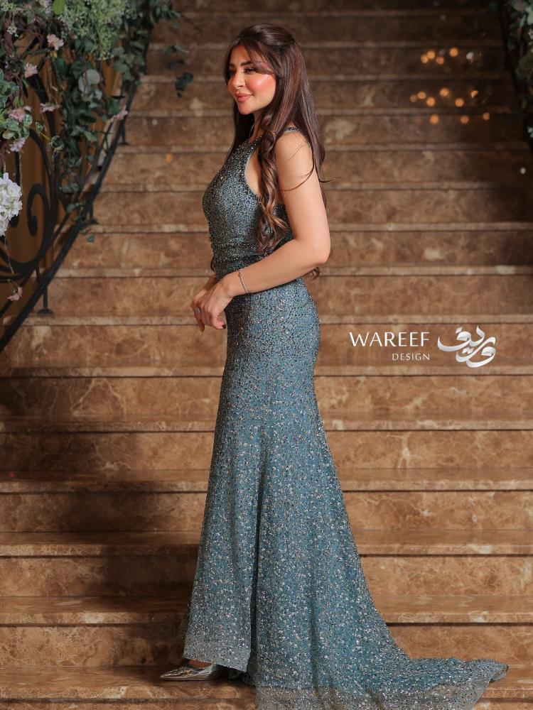 فستان سهرة أنيق بتصميم راقٍ باللون التيفاني الفريد و يمتاز بتطريز لامع وفخم
