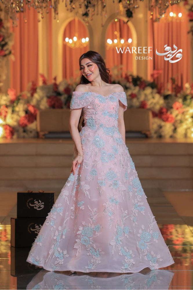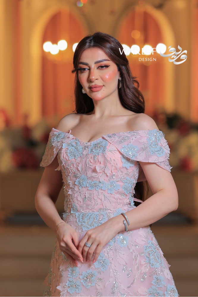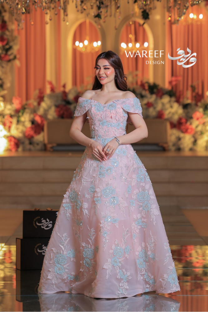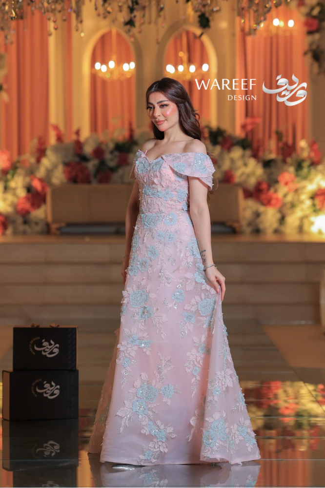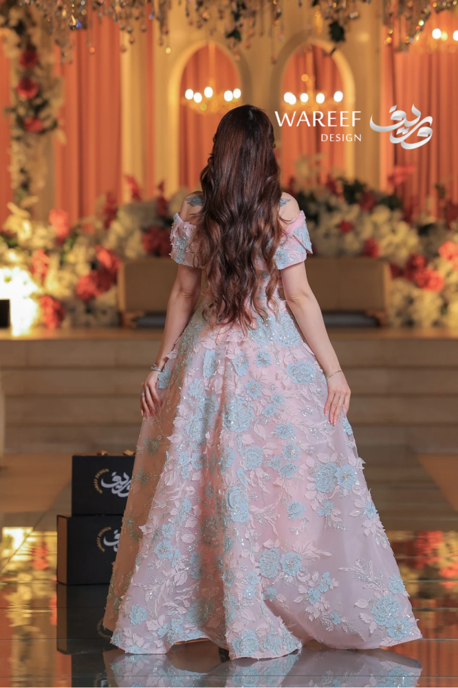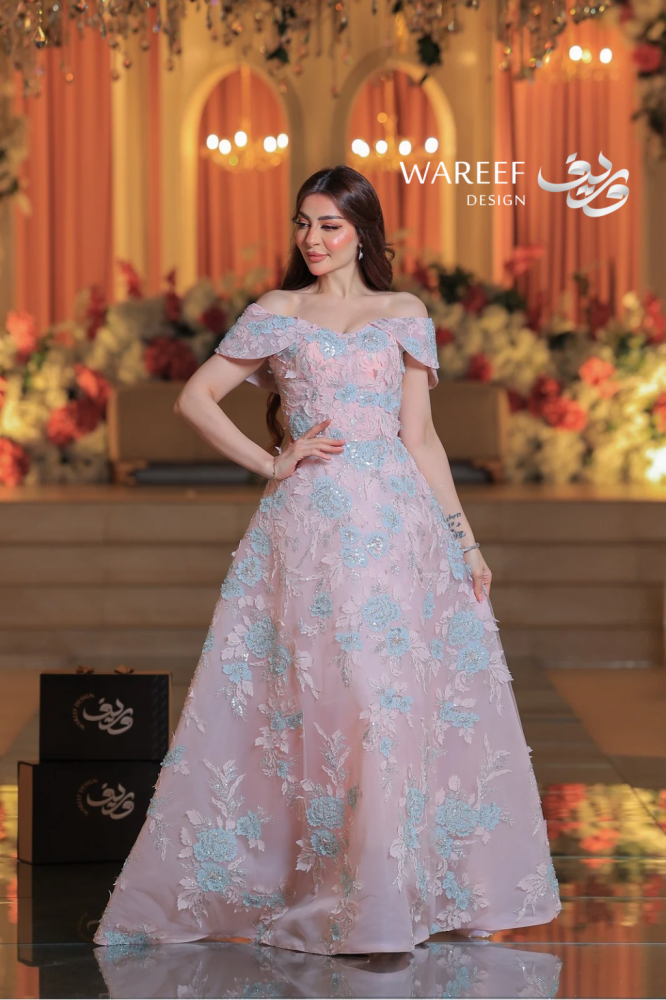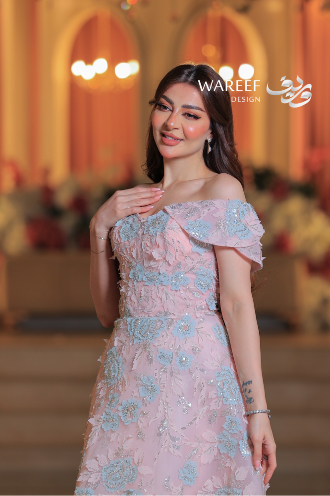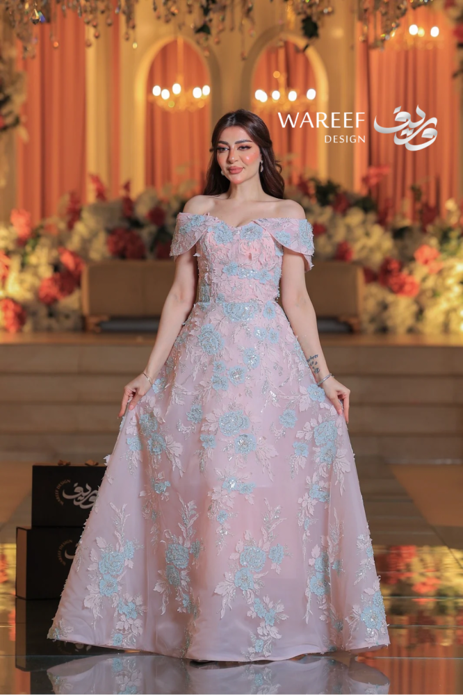 ✨ فستان سهرة فاخر يتميز بتصميم مميز وراقي يدمج بين الأنوثة والفخامة، حيث يبرز الكتف المكشوف ليضيف لمسة من الجرأة والنعومة. يتمتع هذا الفستان بتطريز دقيق للورود بلونين متناسقين من الزهور الزرقاء والوردي مع خيوط لامعة تبرز جمالية الفستان. إنه الخيار المثالي للمناسبات التي تتطلب إطلالة أنيقة ومتفردة.
