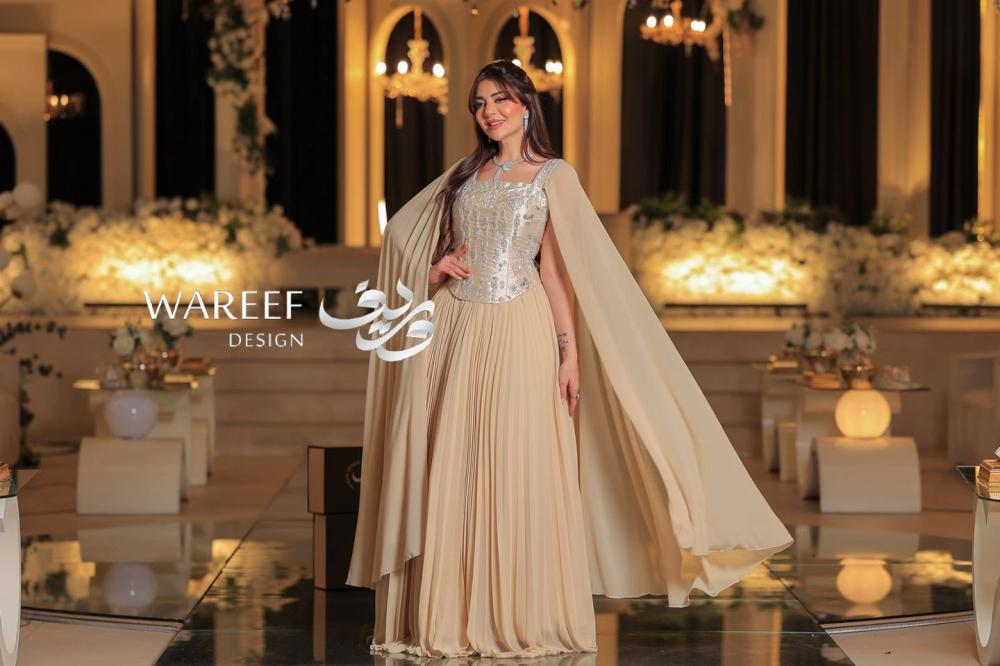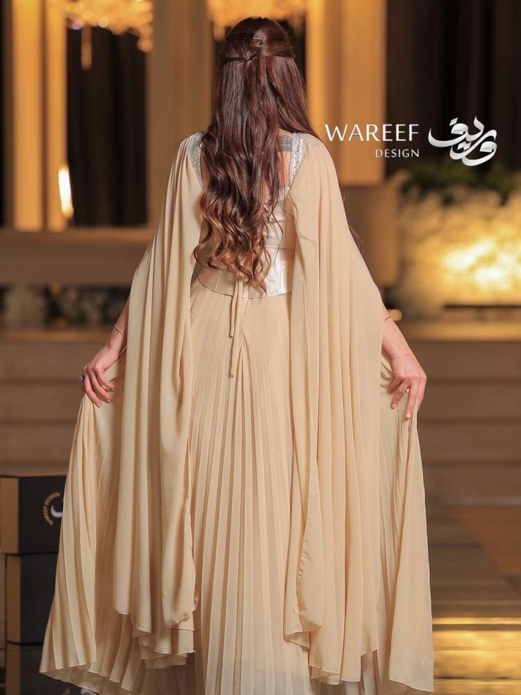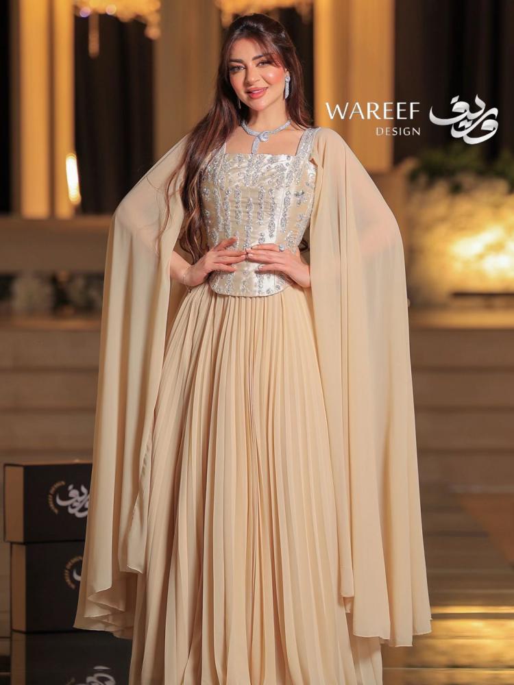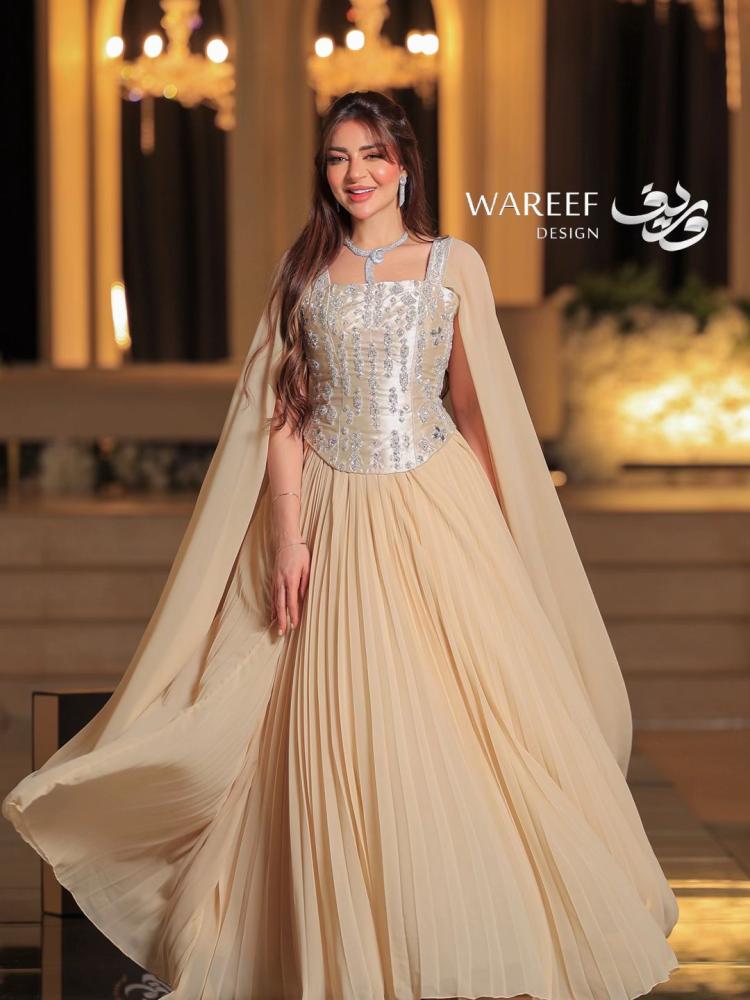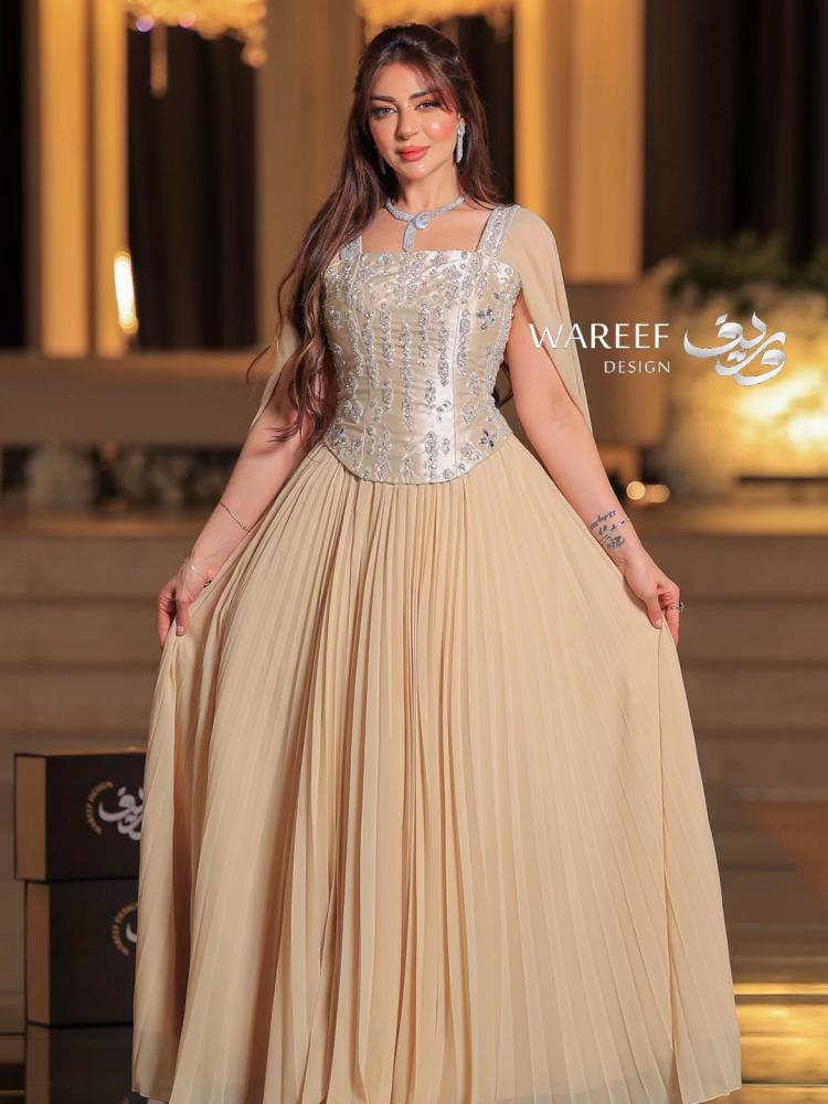 فستان سهرة أنيق بتصميم راقٍ باللون البيج يتميز بالكورسيه و تطريز لامع وفخم