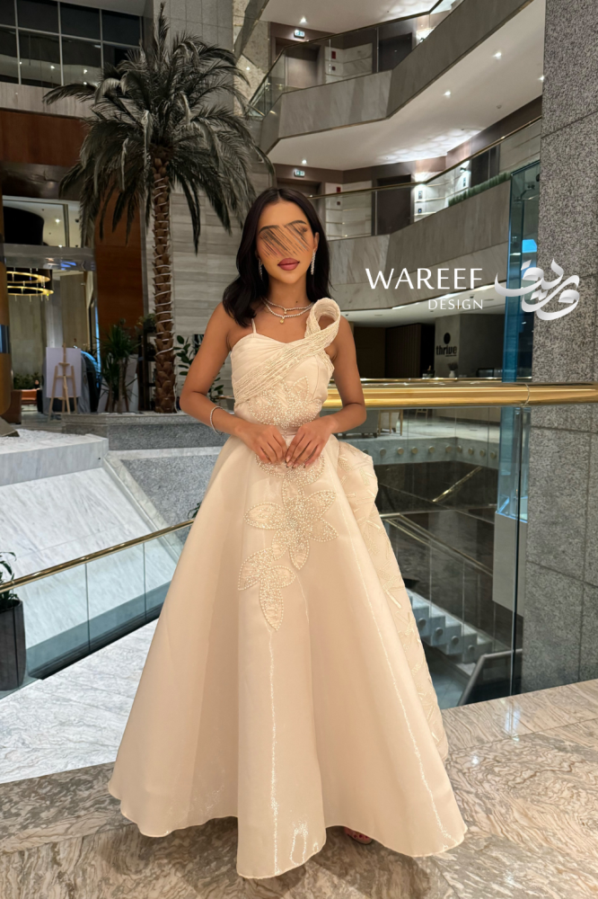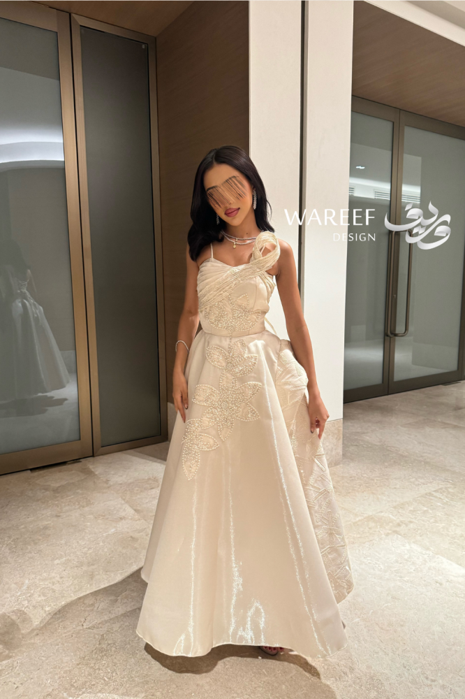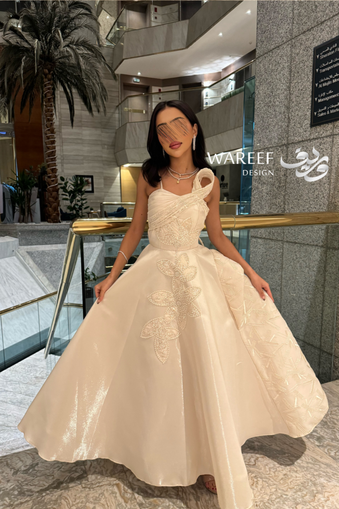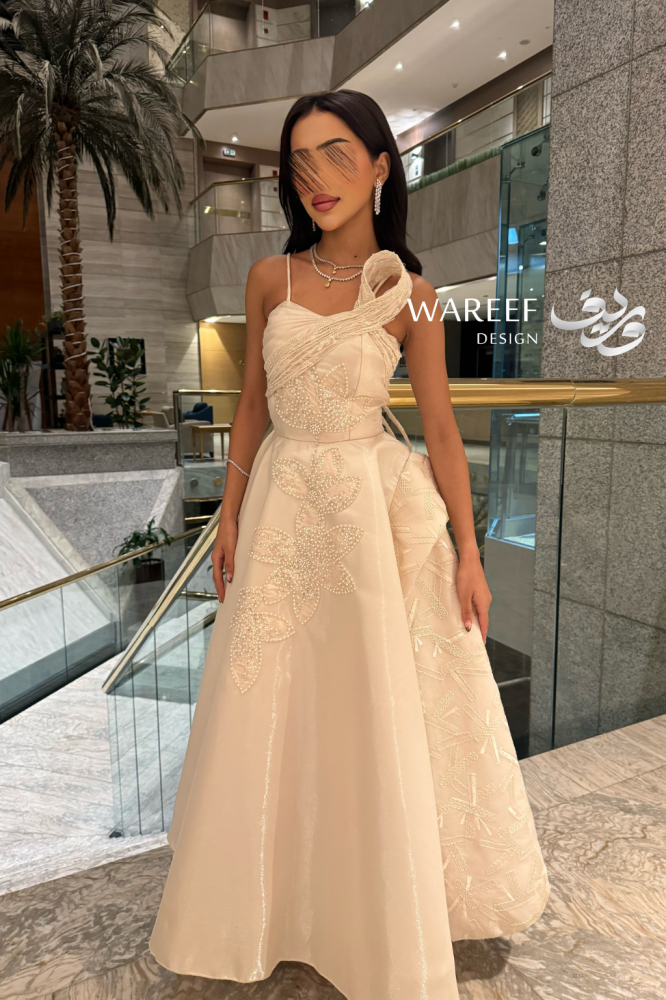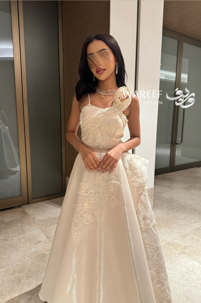 صُمم باللون البيج الفاخر، وصُنِع من قماش الميكادو اللامع الذي يضفي لمسة فخامة من أول نظرة، ومُزّين بتطريز فصوص لامعة تضيف لمسة من البريق دون مبالغة.