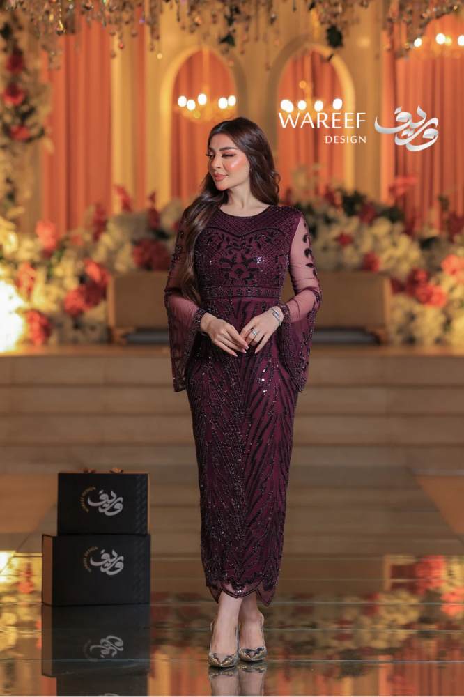 • الأقمشة الفاخرة تتناغم مع التطريز اللامع والأحجار المتقنة.
