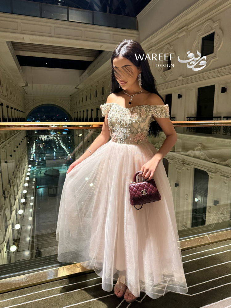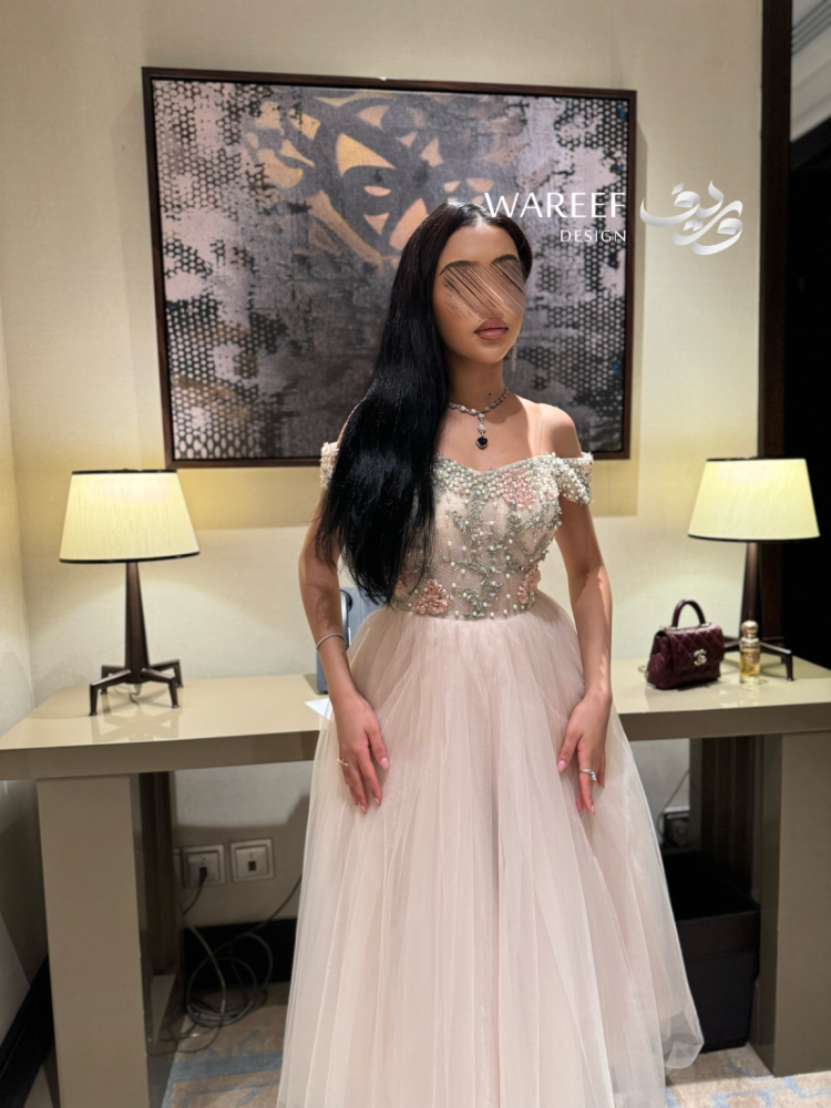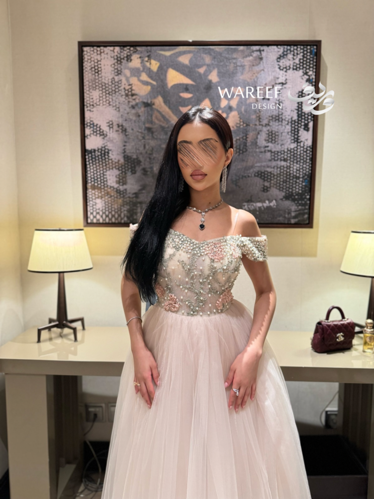 اللون والتصميميأتي الفستان بلون وردي فاتح مائل للعاجي (Blush Nude) يعكس الدفء والرقة ويُبرز جمال البشرة بلمسة حالمة. تصميمه يجمع بين الفخامة الملكية والبساطة الراقية بأسلوب أنثوي يليق بالسهرات المميزة والمناسبات الرومانسية.