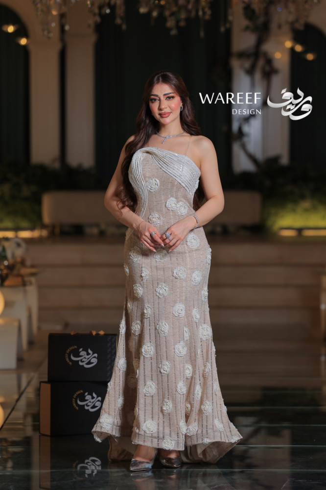 فستان سهرة بيج مزين بورود ثلاثية الأبعاد بتصميم أنثوي ناعم
