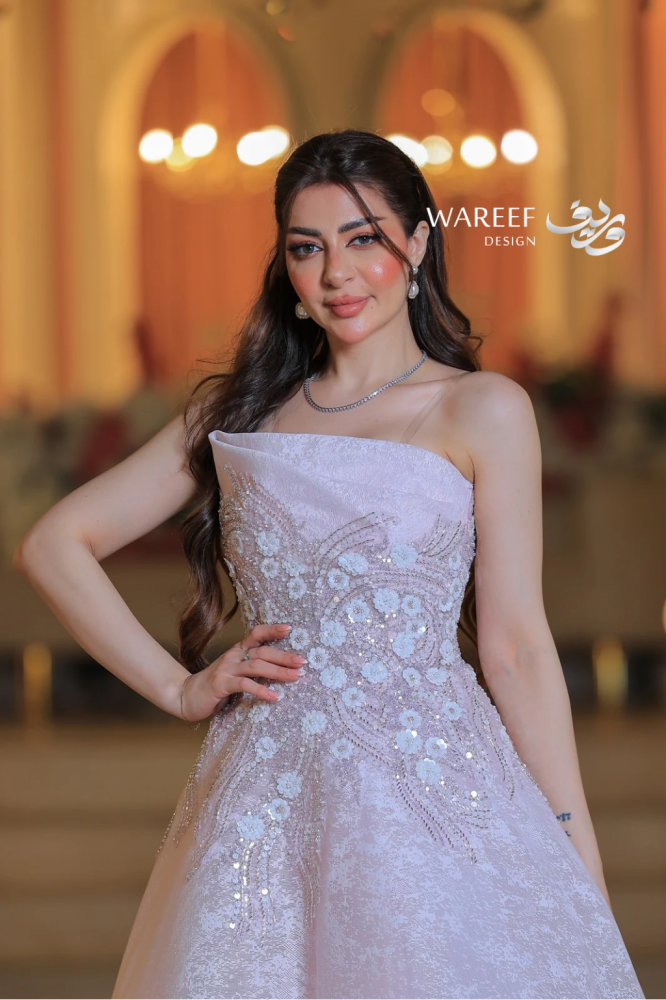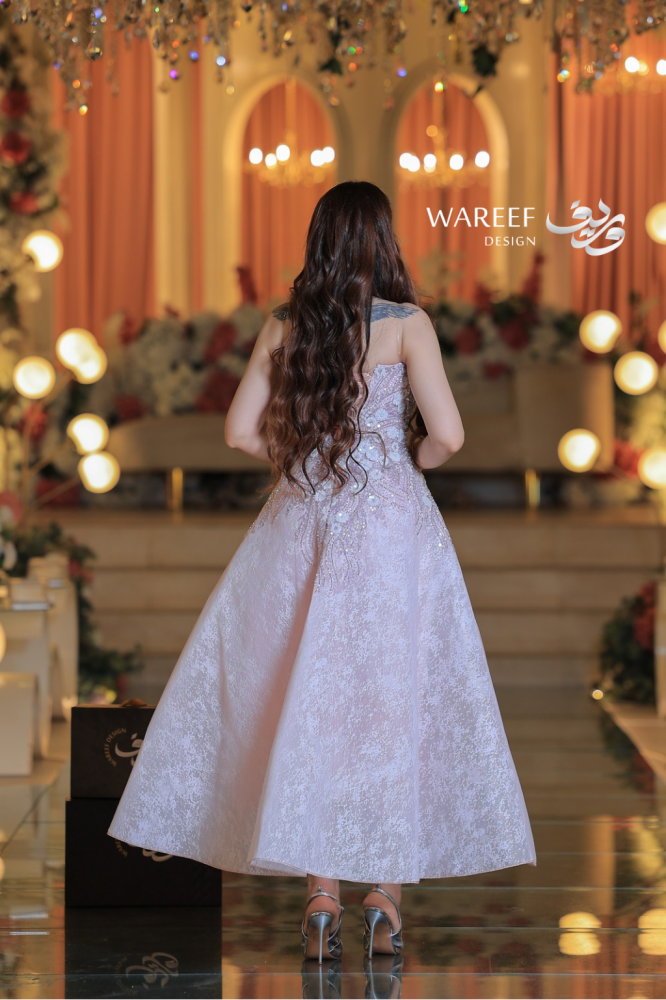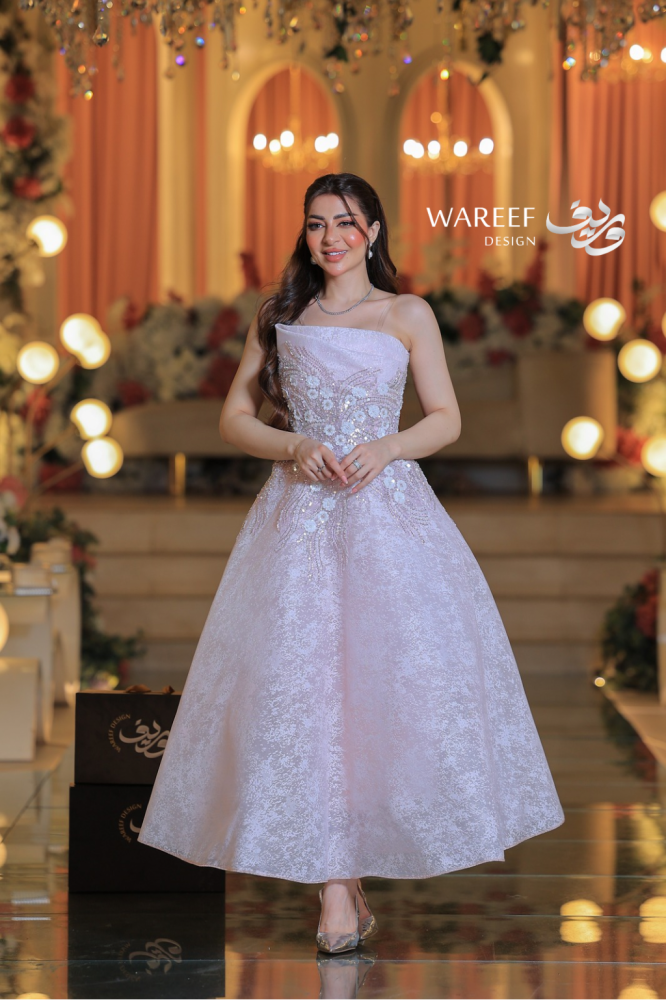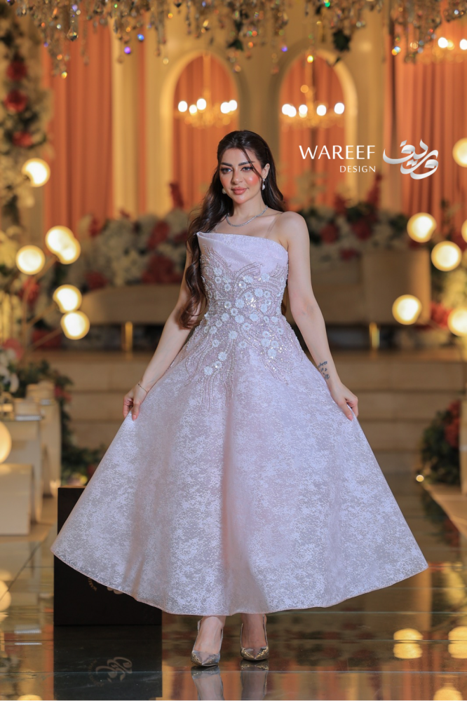 تميزي بإطلالة ساحرة ومميزة مع فستان سهرة زهري رائع بتفاصيل تطريزات لامعة على الجزء العلوي من الفستان. التصميم العصري والمتقن يجعل هذا الفستان اختيارًا مثاليًا للمناسبات الخاصة والسهرة الفاخرة.