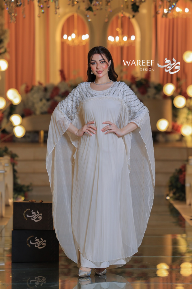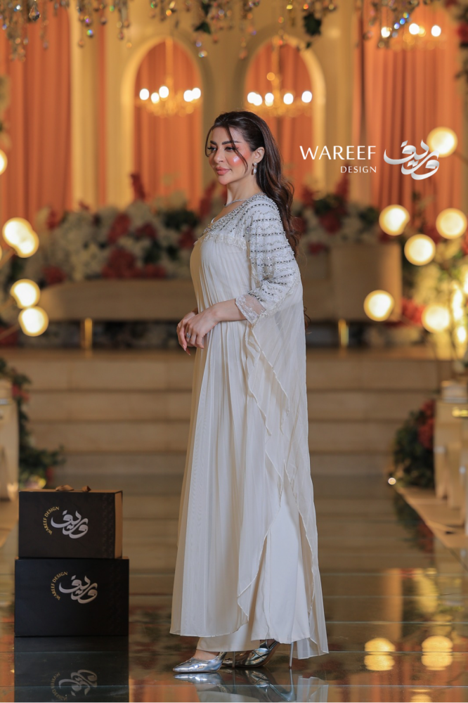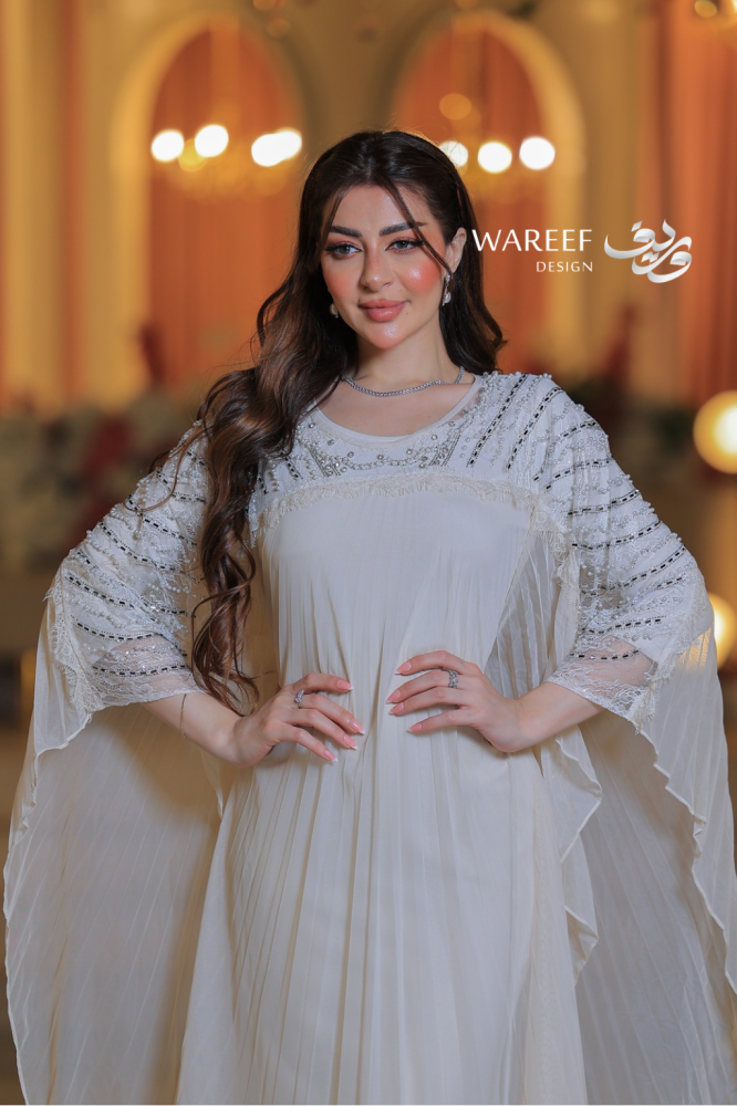 - الجزء العلوي: مزخرف بتطريز أنيق يبرز تفاصيل الخرز اللامع مع لمسة من الأقمشة الشفافة.