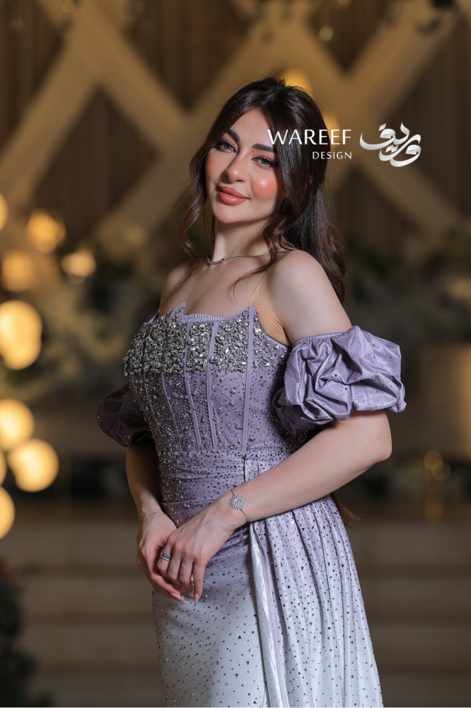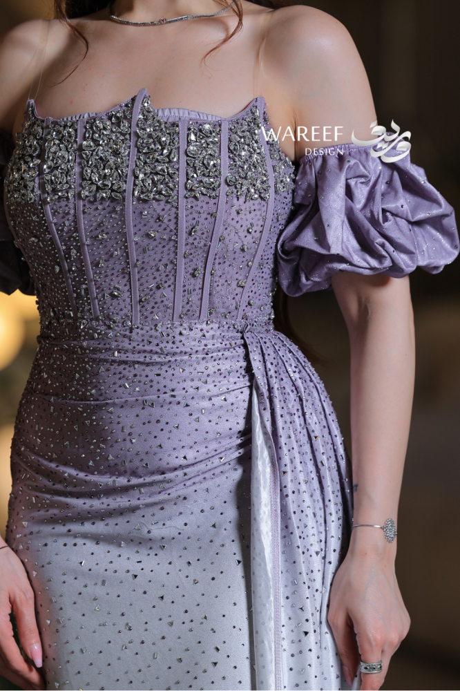 اللون والتصميميأتي الفستان بلون بنفسجي فاتح متدرّج إلى درجات فضية لؤلؤية تمنح الإطلالة عمقًا بصريًا ولمعانًا ساحرًا. تصميمه يجمع بين الرقي الكلاسيكي والجرأة الراقية، ليعكس فخامة عصرية تلائم ذوق المرأة الراقية.