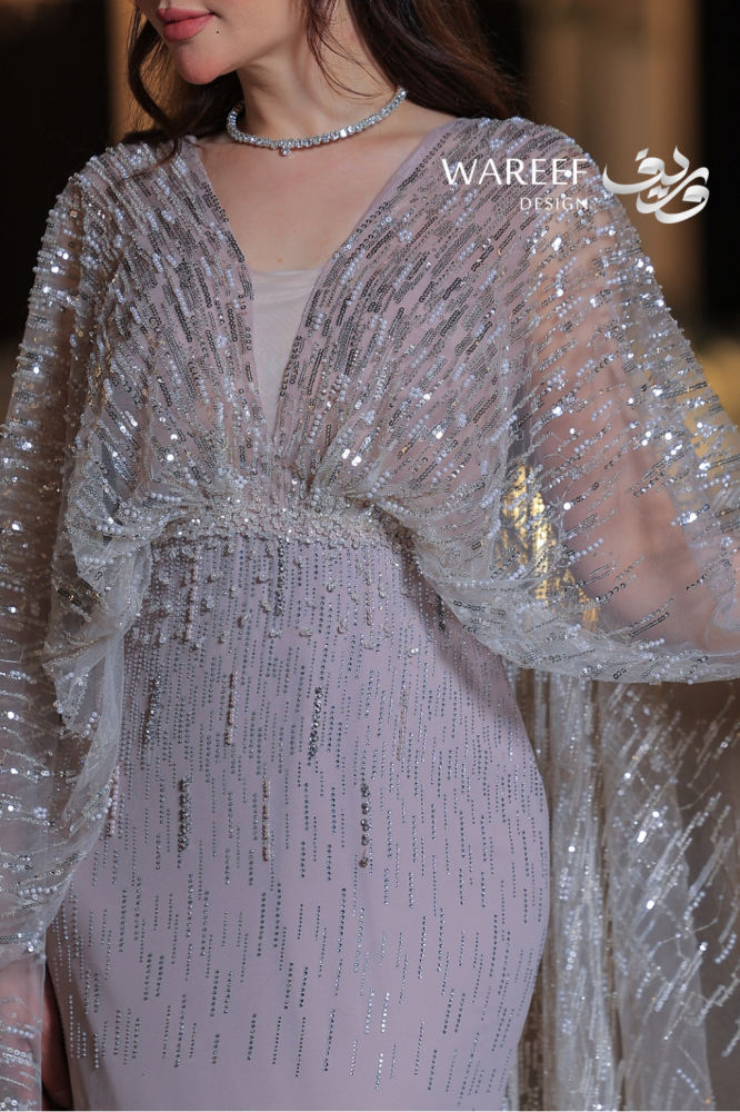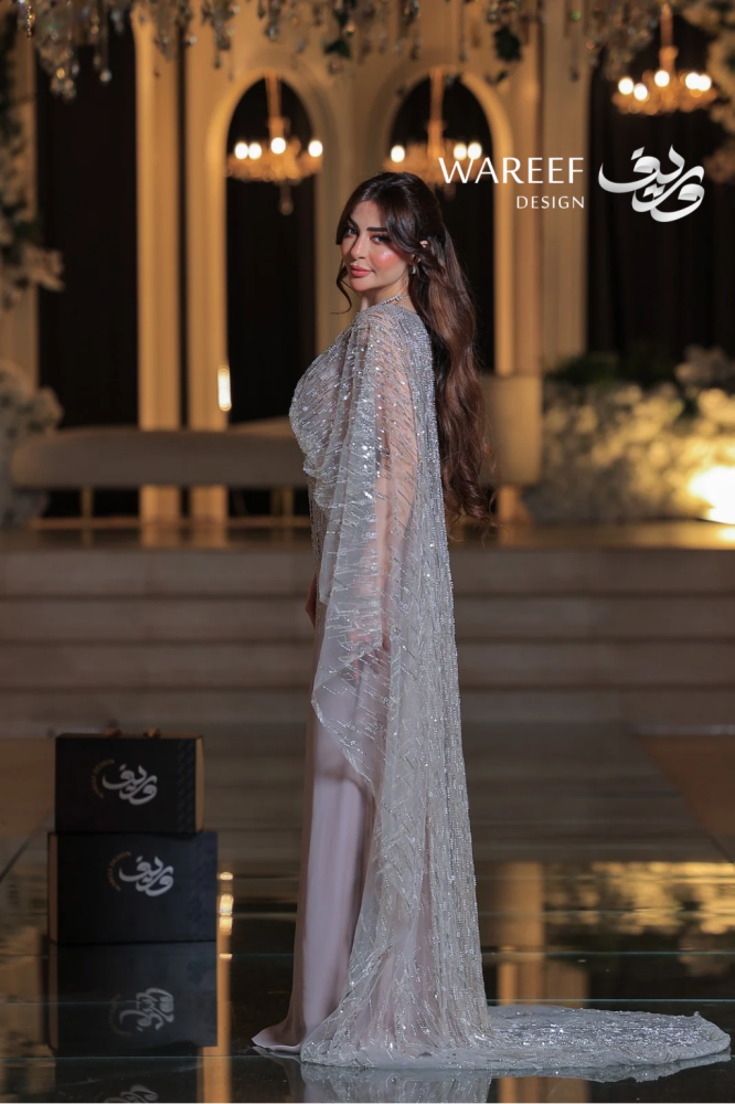 - الكاب الملكي: اللمسة الأكثر سحراً هي الكاب الشفاف الذي ينسدل من الكتفين، والمزخرف بالكامل بتطريز يدوي متقن من الخرز الفضي اللامع، والذي يمتد ليحدد منطقة الخصر أيضاً، مضيفاً بعداً ملكياً للإطلالة.