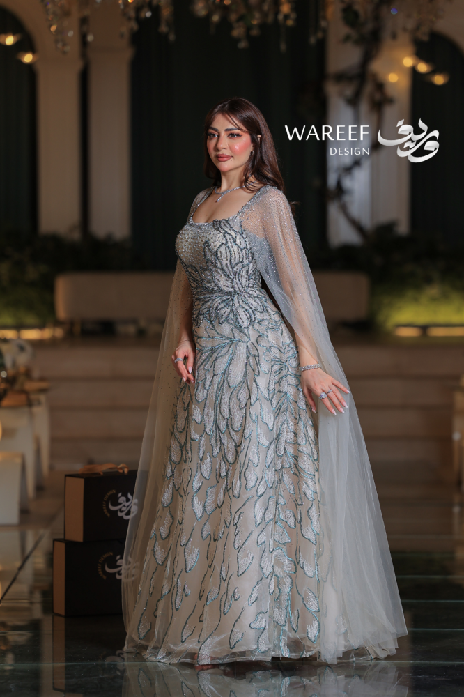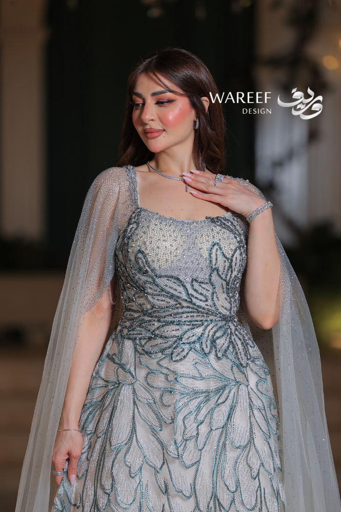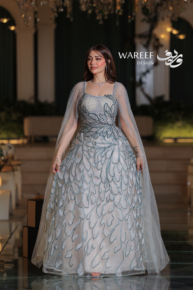 تألقي بإطلالة ملكية تخطف الأنظار مع فستان سهرة ملكي أزرق بتطريز فاخر وكاب طويل شفاف. مزيج درجات الأزرق الفاتح مع الفضي البراق يمنحك إشراقة ساحرة، بينما يضفي الكاب المطرز لمسة فخامة وأناقة استثنائية. قطعة مثالية للمرأة السعودية التي تبحث عن تصميم فاخر يعكس شخصيتها الراقية في المناسبات الخاصة والأعراس الفاخرة.