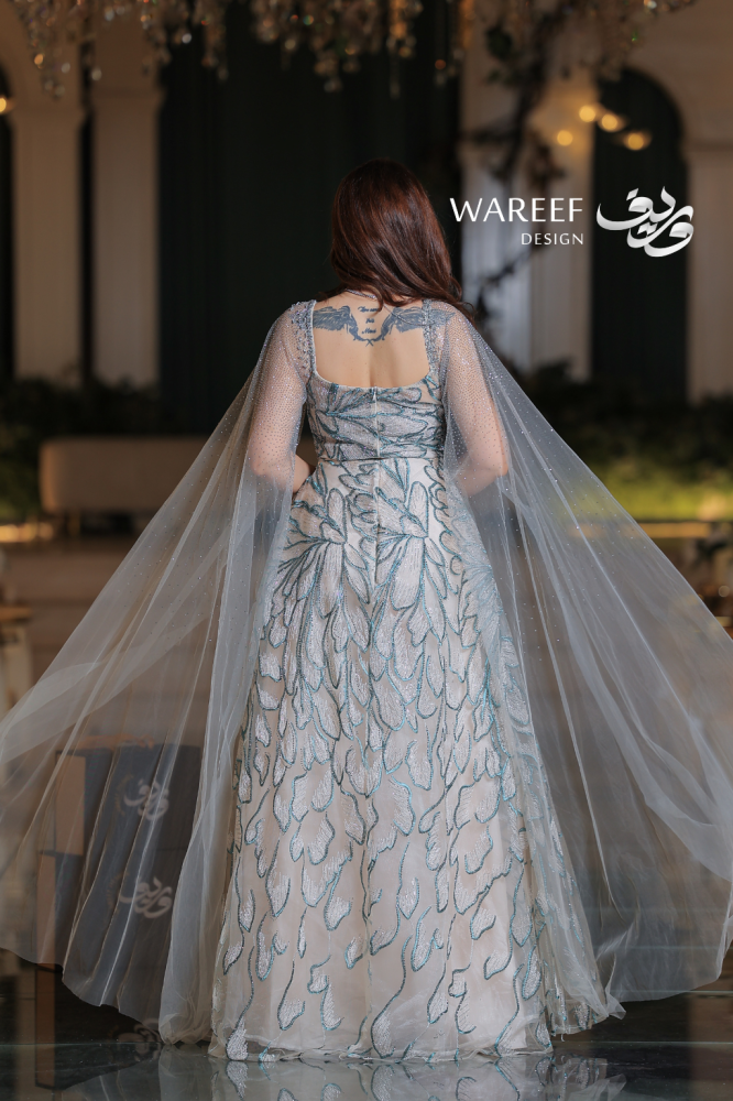 فستان سهرة ملكي طويل بتطريز تيفاني فاخر وكاب شفاف أنيق