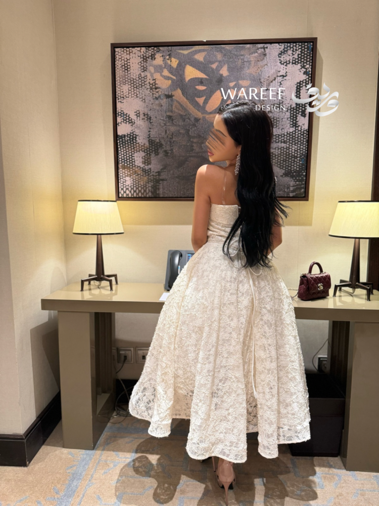 أما الخصر المحدّد فينساب بسلاسة نحو تنورة واسعة بانسيابية فخمة، ويُكملها ظهر مفتوح بخطوط ناعمة تضيف لمسة من الجرأة الأنيقة دون مبالغة.