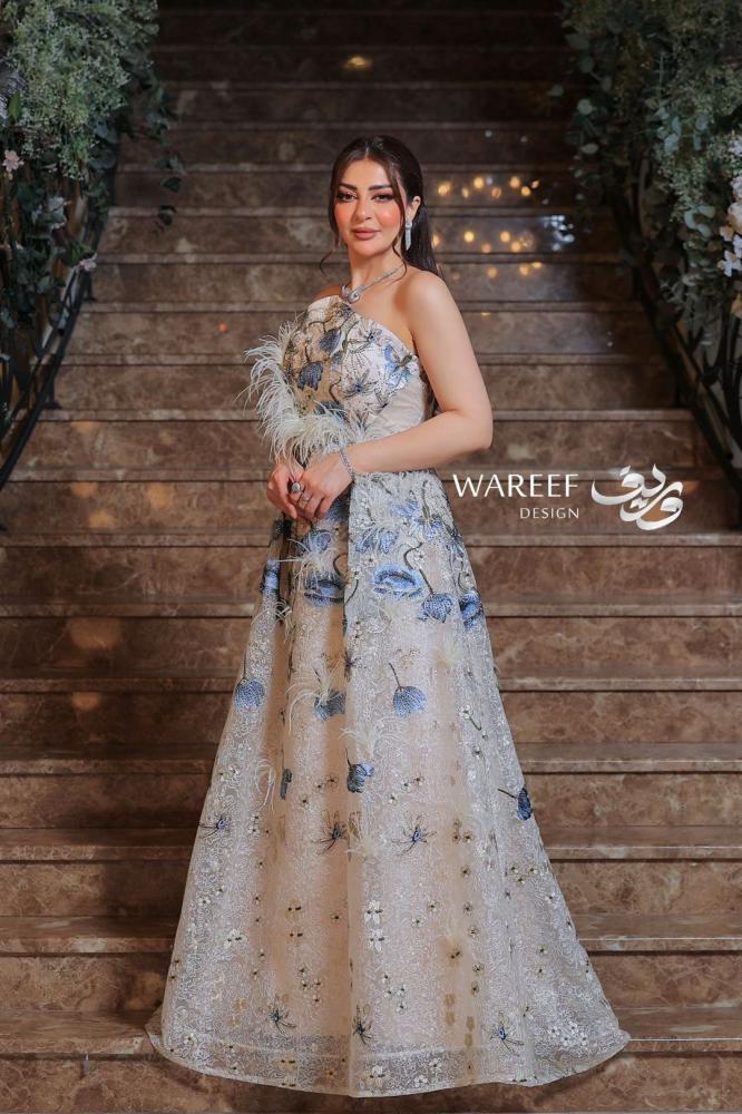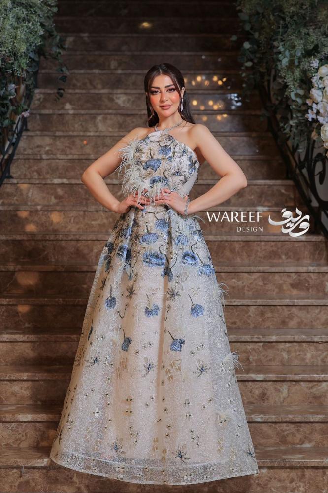فستان سهره انيق بتصميم راقٍ باللون الابيض مزين بالشك الازرق و الريش