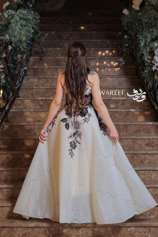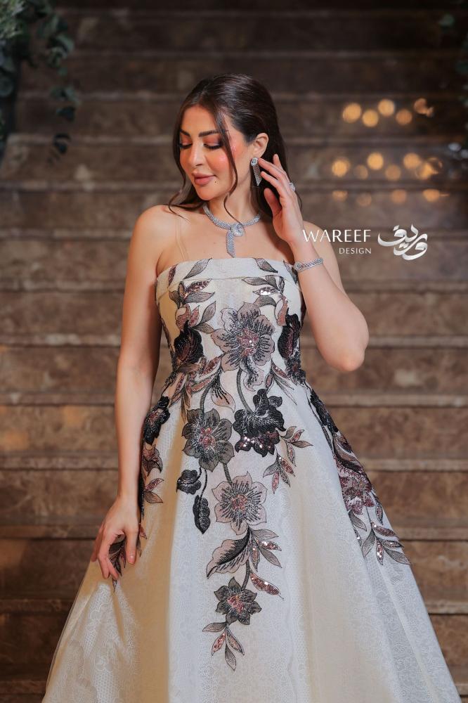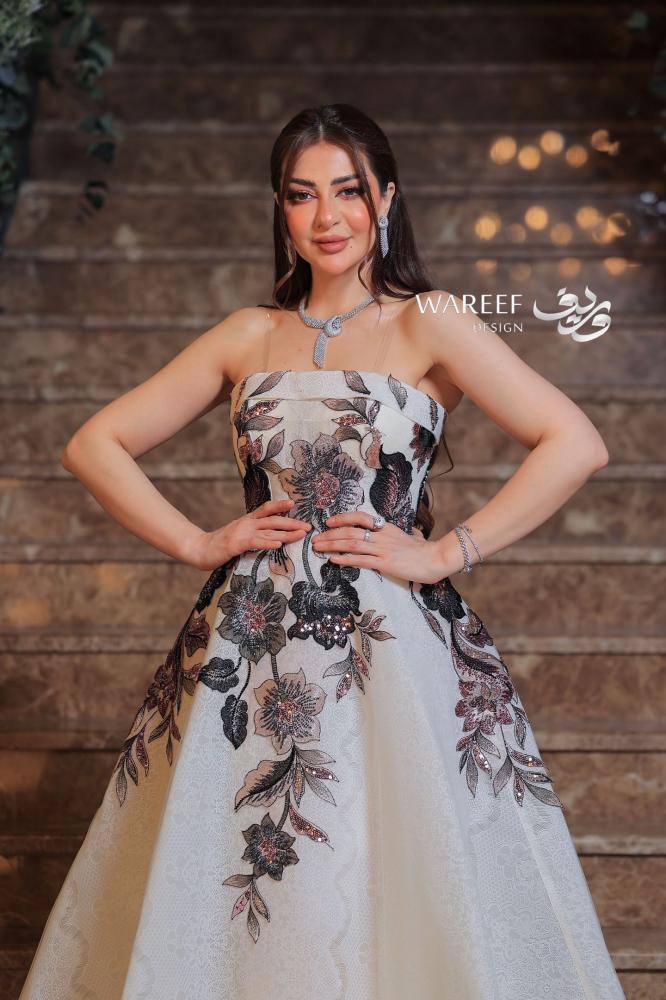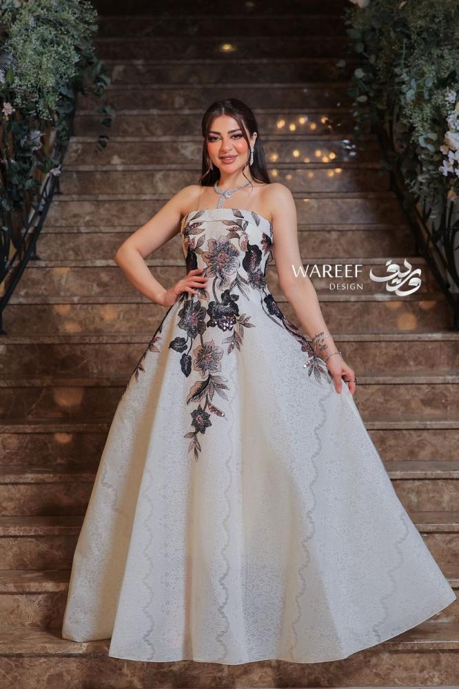فستان سهره انيق بتصميم راقٍ باللون الابيض مزين بالشك المشجر الفخم