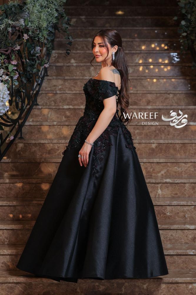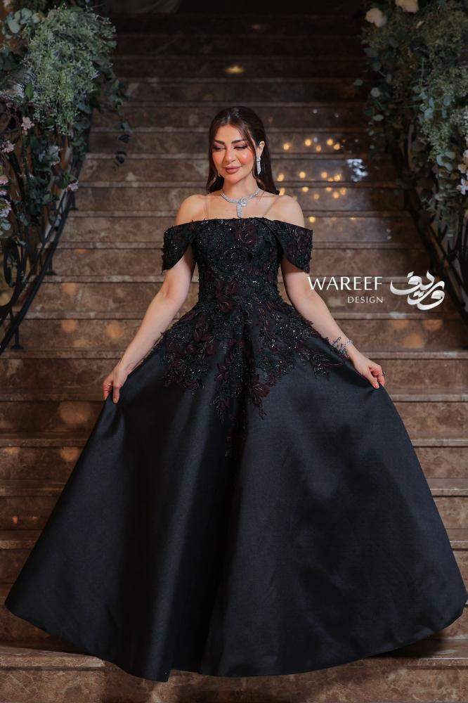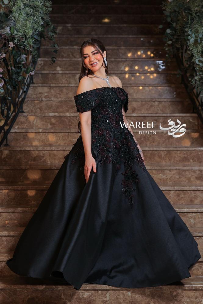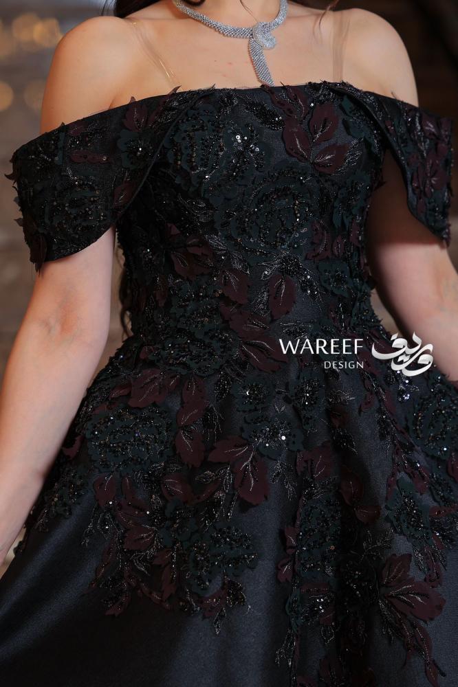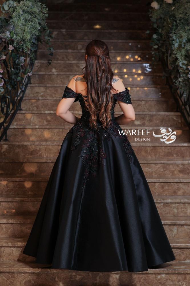 فستان سهره انيق بتصميم راقٍ باللون الاسود مزين بتطريز الاحمر الفخم