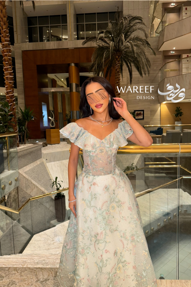 الفستان بقصة A-Line أوف شولدر، ضيق من الأعلى لينسدل بانسيابية على القوام. الأكتاف المكشوفة تضيف لمسة عصرية جذابة، فيما يزين التطريز المشجر كامل التصميم ليمنحه مظهراً فنياً أنيقاً ومتفرداً.