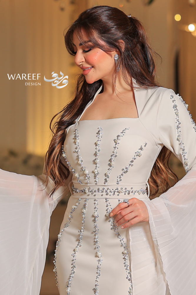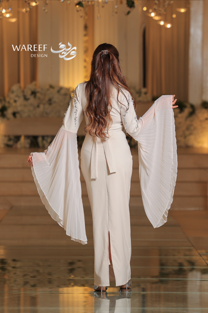 فستان سهرة أنيق بتصميم راقٍ باللون البيج و يتماز بيتطريز اللامع واكمام واسعه وطويله