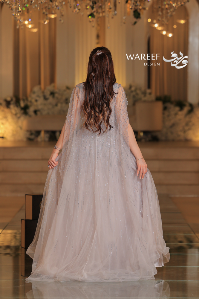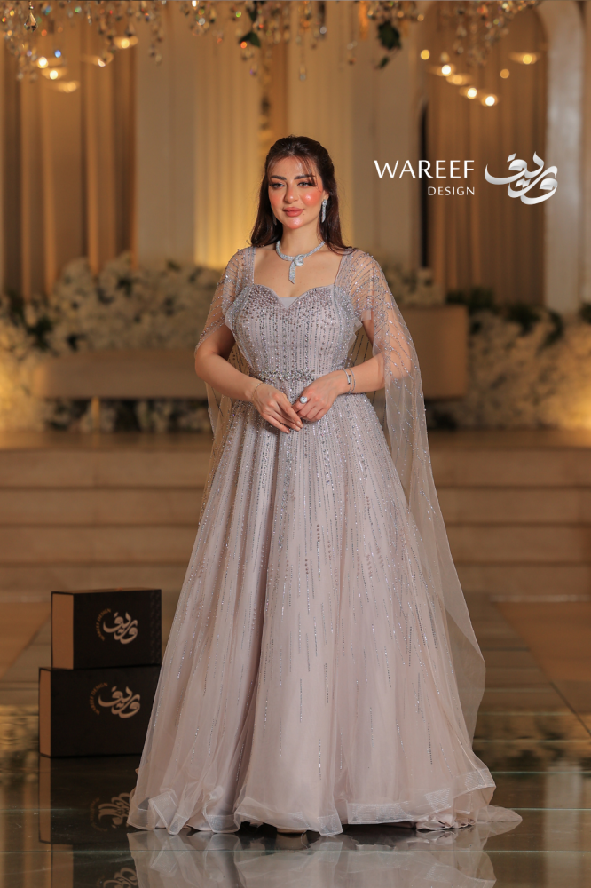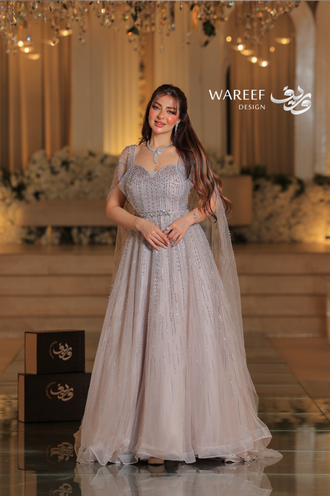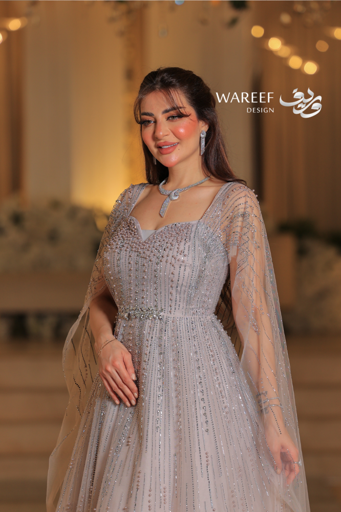 فستان سهرة آسر من "واريف ديزاين"، يجسّد الأناقة الهادئة والرقيّ الكلاسيكي بلمسة معاصرة. تصميمه الفخم يعكس روح الفخامة بأسلوب ناعم ومفعم بالأنوثة.