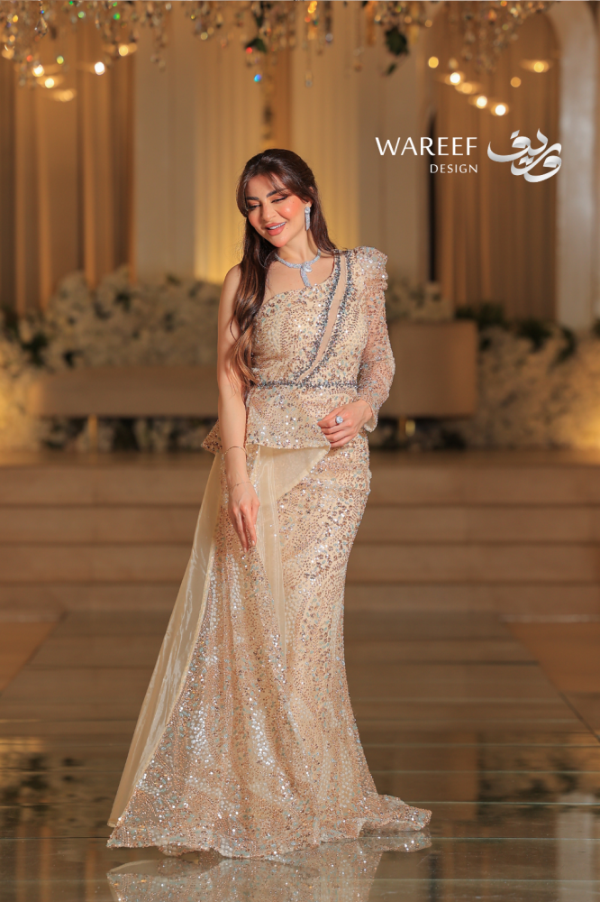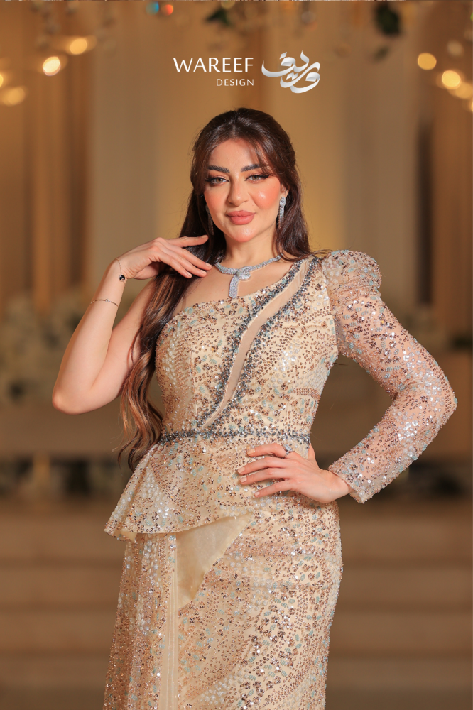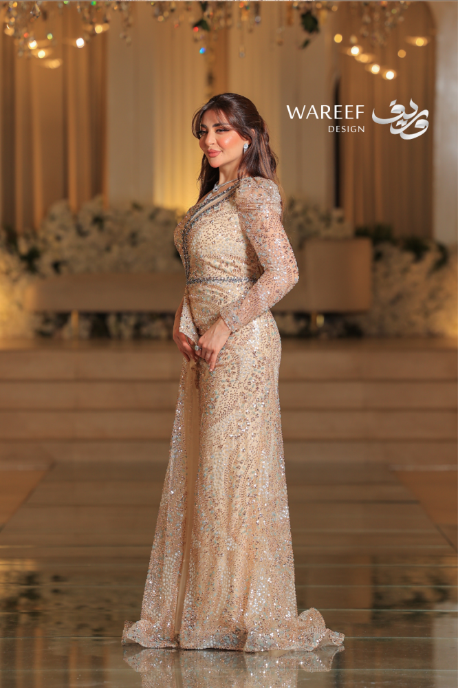 فستان سهرة أنيق بتصميم راقٍ باللون الذهبي ، يتميز بالتطريز اللامع وذيل جانبي فخم