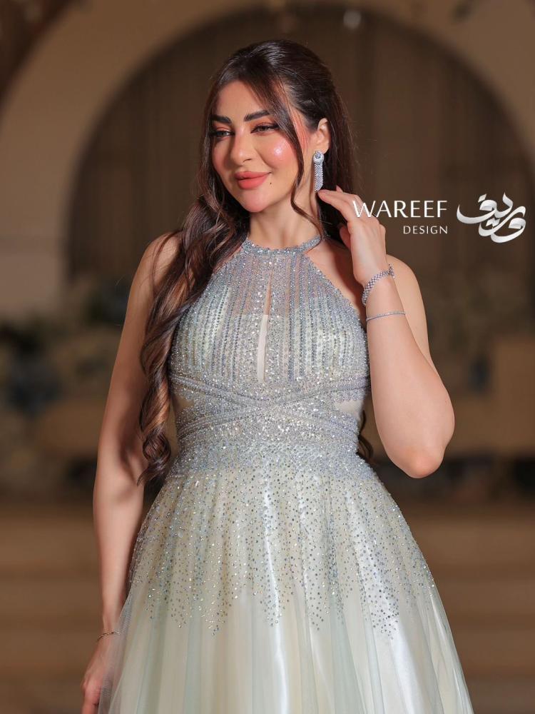 فستان يفيض رقة وإشراق، مستوحى من صفاء الجليد ولمعة قطرات الندى. إطلالة فاخرة وهادئة في نفس الوقت.