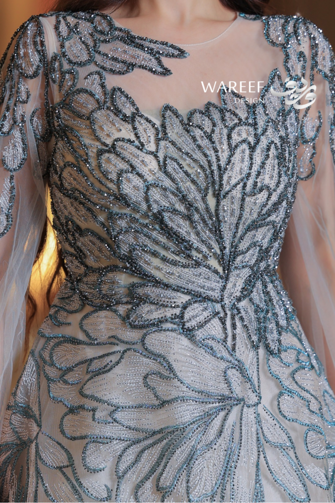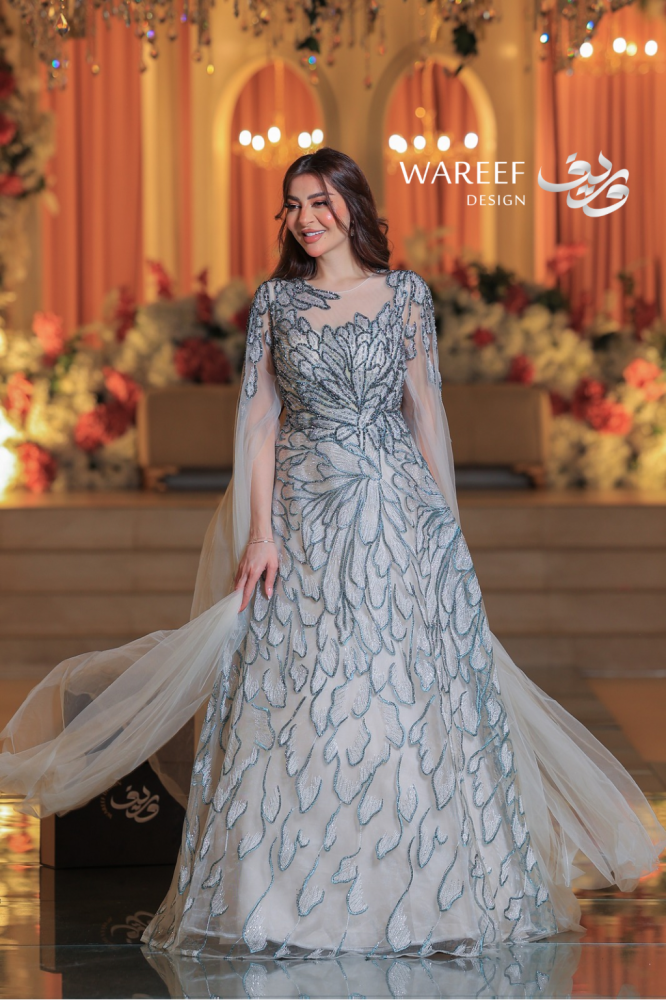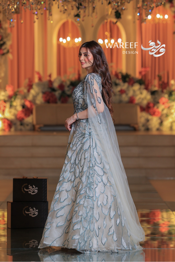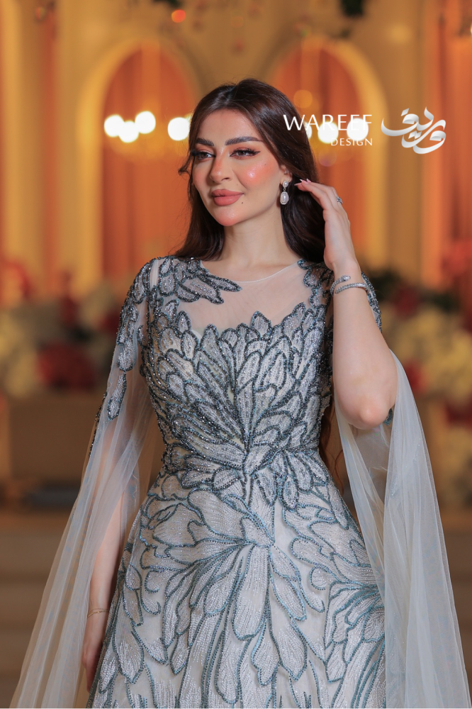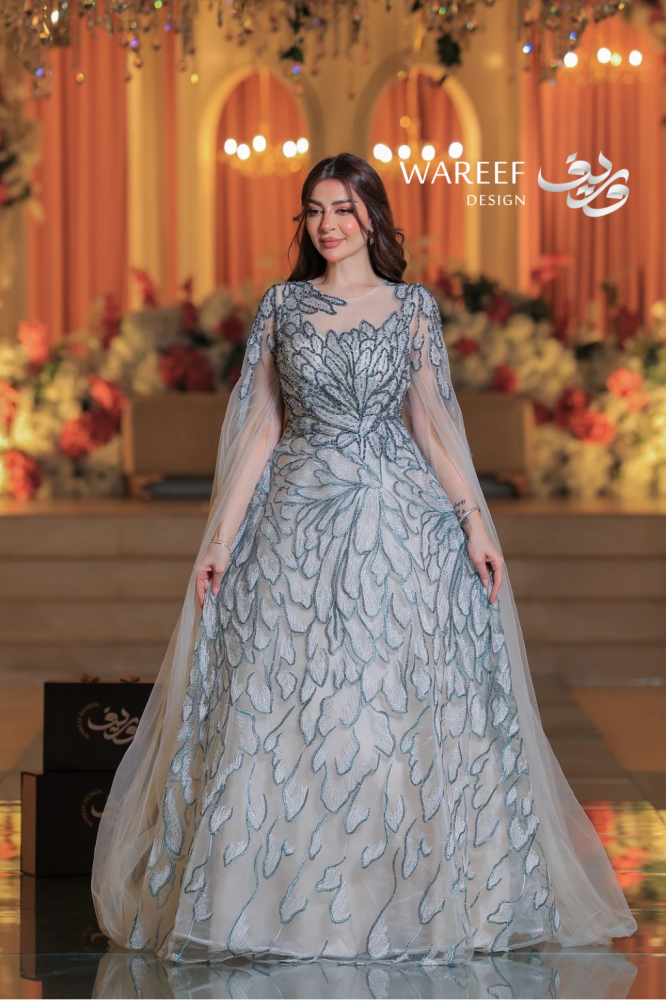 تميزي بإطلالة استثنائية تخطف الأنظار مع فستان فضي طويل مطرز يدوياً بكاب شفاف ملكي. تصميمه مستوحى من الطبيعة بنقوش أوراق متداخلة تمنحك حضوراً ملكياً يبهر كل من يراكِ.