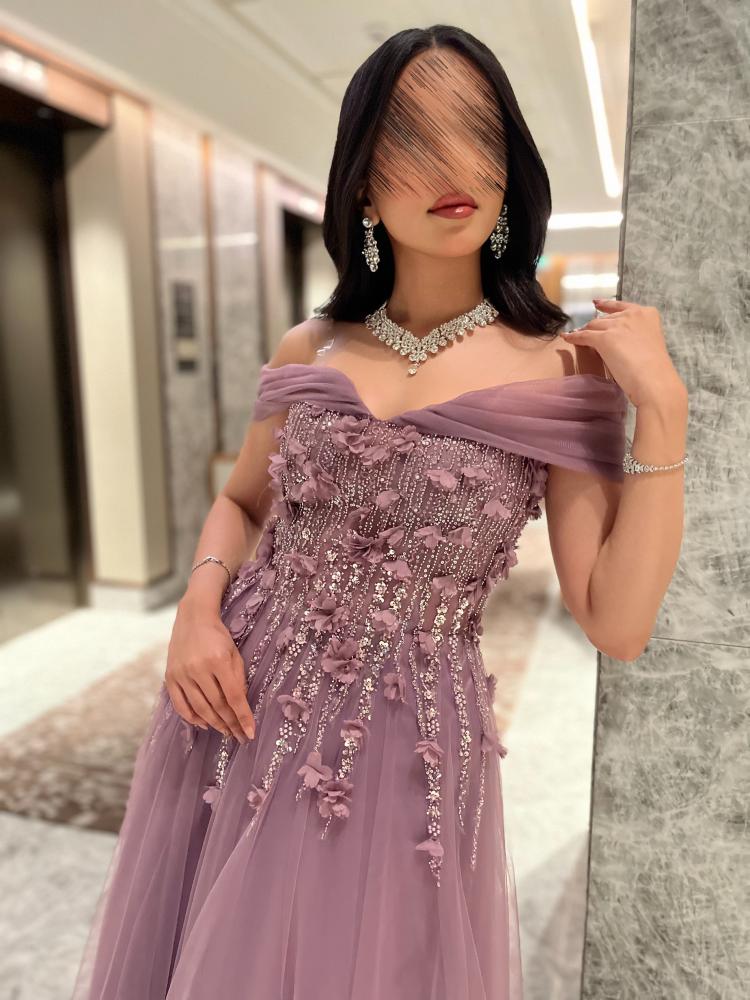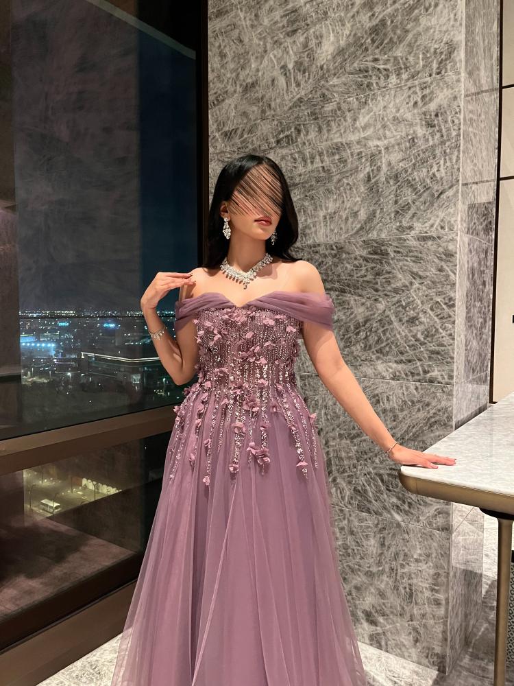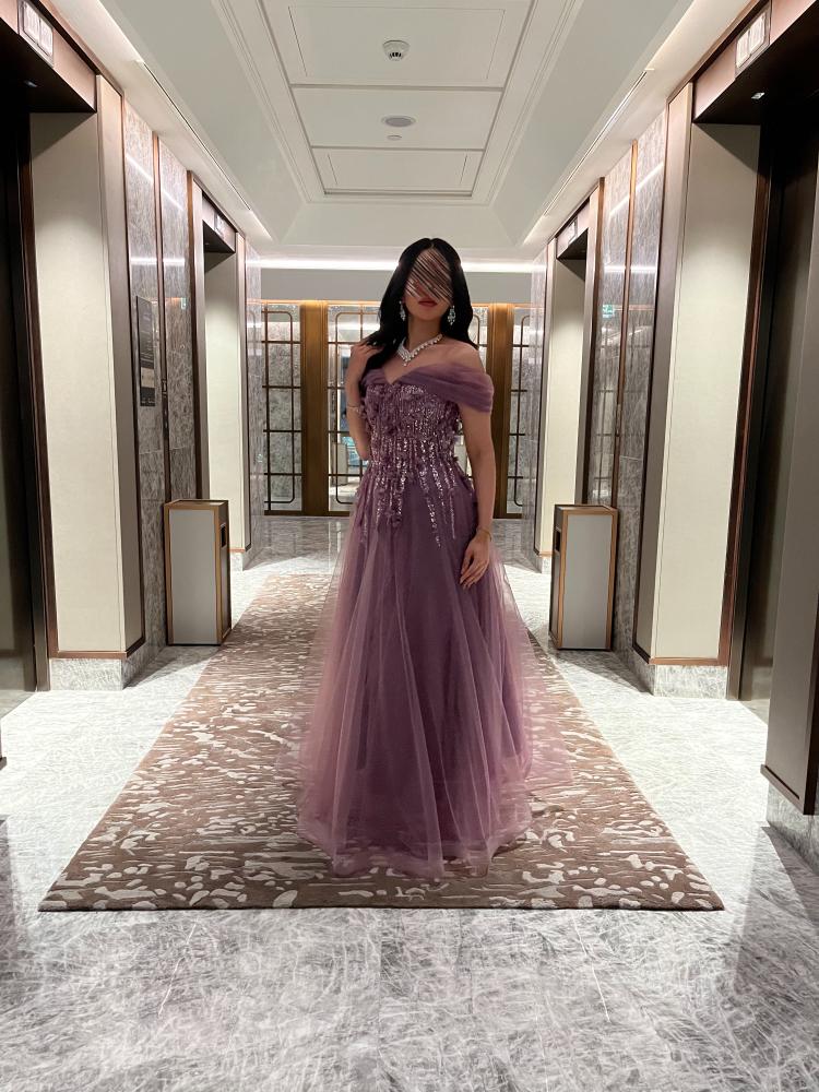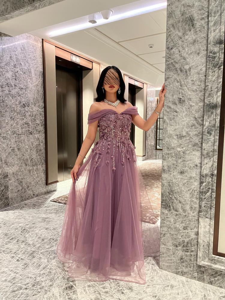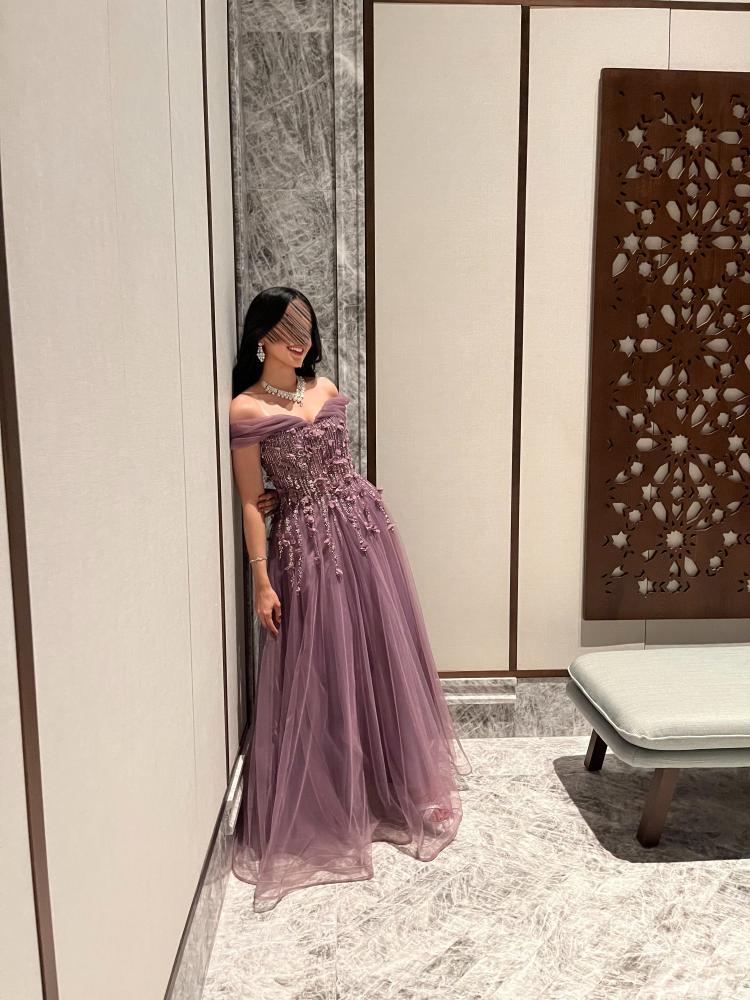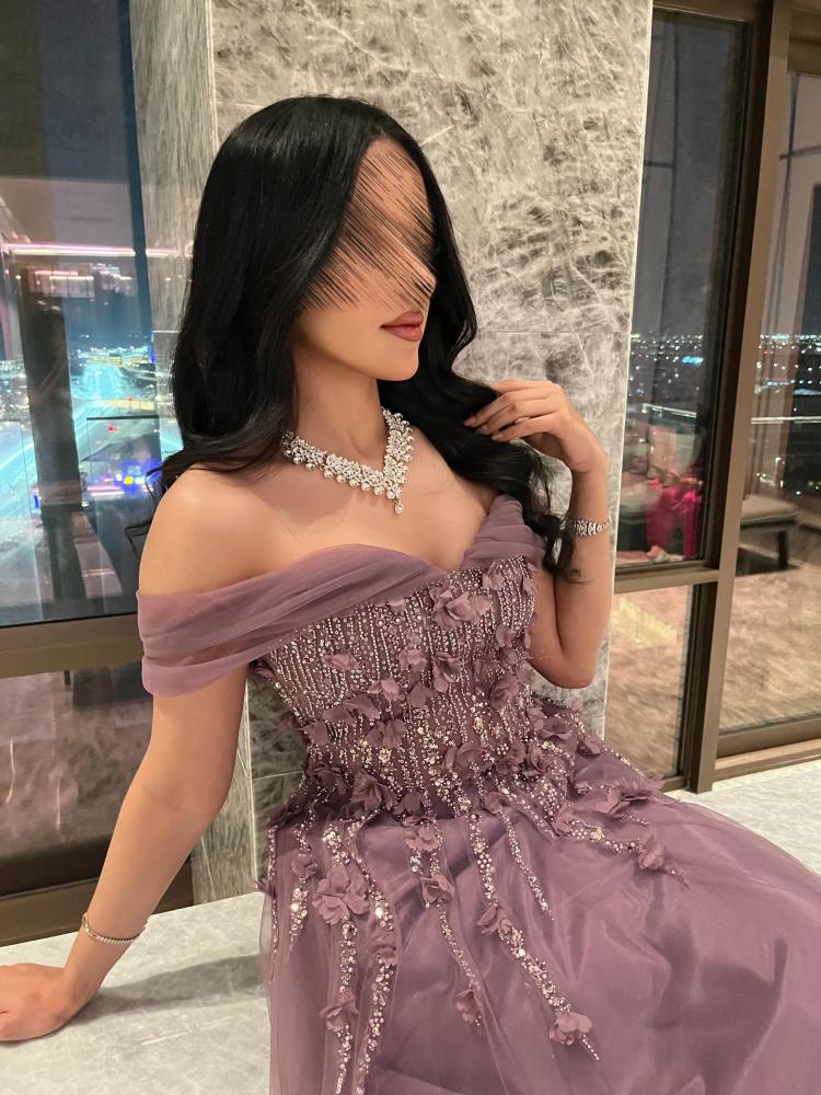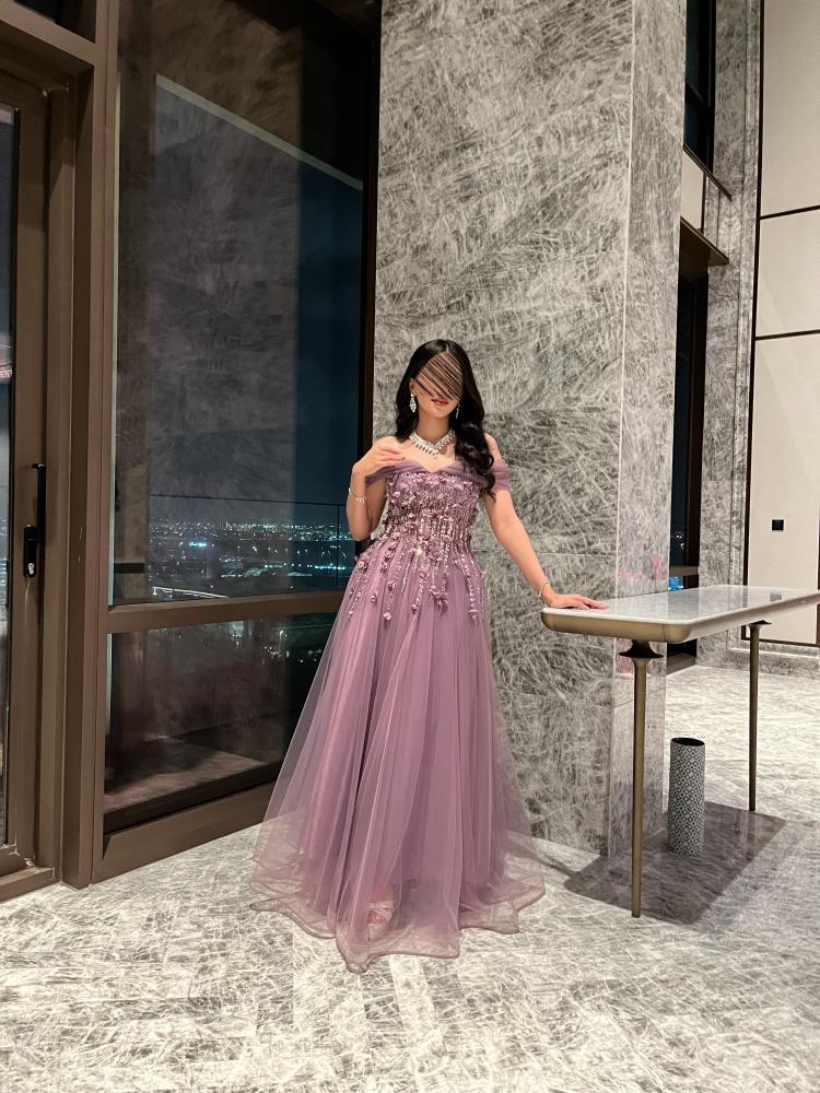 فستان طويل سهره تل ناعم مع كلفه ورود راقي