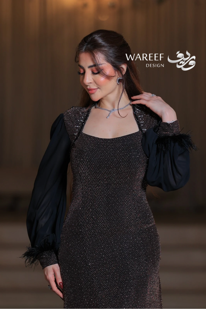 - أناقة درامية: الأكمام المنفوخة مع الريش تضفي لمسة درامية راقية على التصميم، وتضمن لكِ إطلالة ملفتة ومميزة.