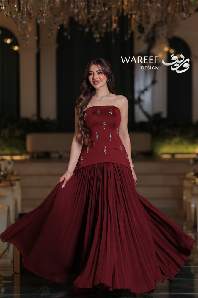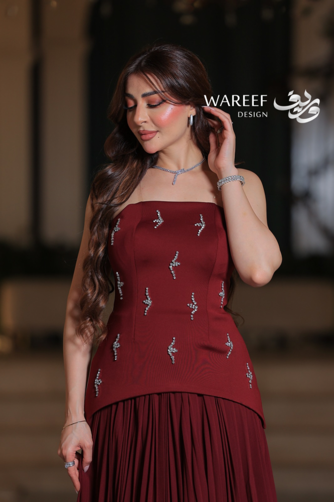 - اللون والقماش: لون عنابي غامق ودافئ، يمنح إحساساً بالفخامة والرقي. الجزء العلوي مصنوع من الكريب الفاخر، بينما التنورة مصنوعة من الشيفون البليسيه عالي الجودة.