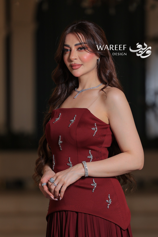 - التطريز: يتميز الجزء العلوي بتطريز ناعم من الكريستالات الصغيرة اللامعة، موزعة بطريقة فنية على منطقة الصدر لتضيف لمسة من البريق دون مبالغة.