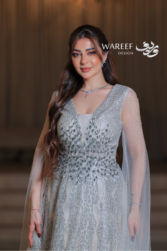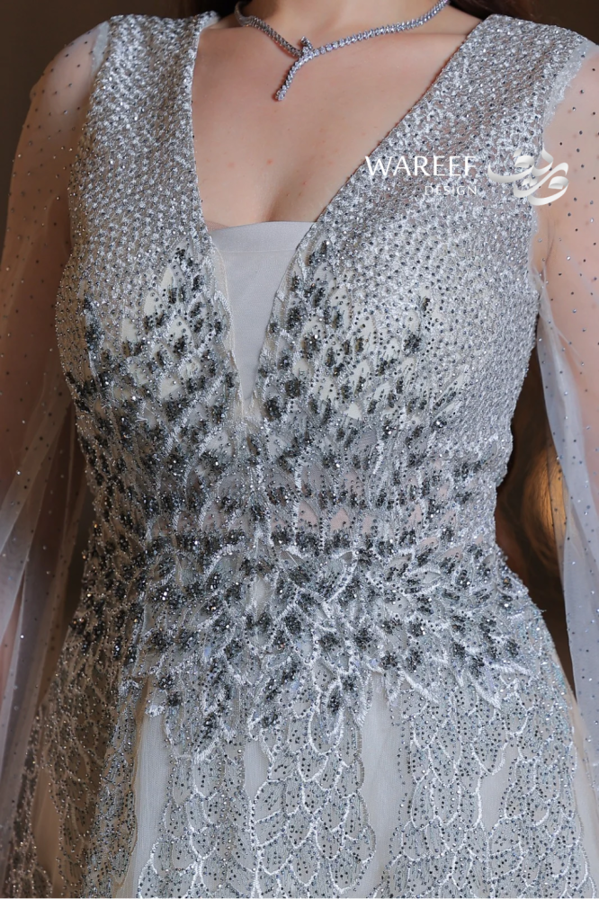 هذا ليس مجرد واحد من فساتين السهرة باللون الفضي، بل هو تجربة فريدة من الأناقة والجمال. إليكِ تفاصيل تصميمه الراقي: