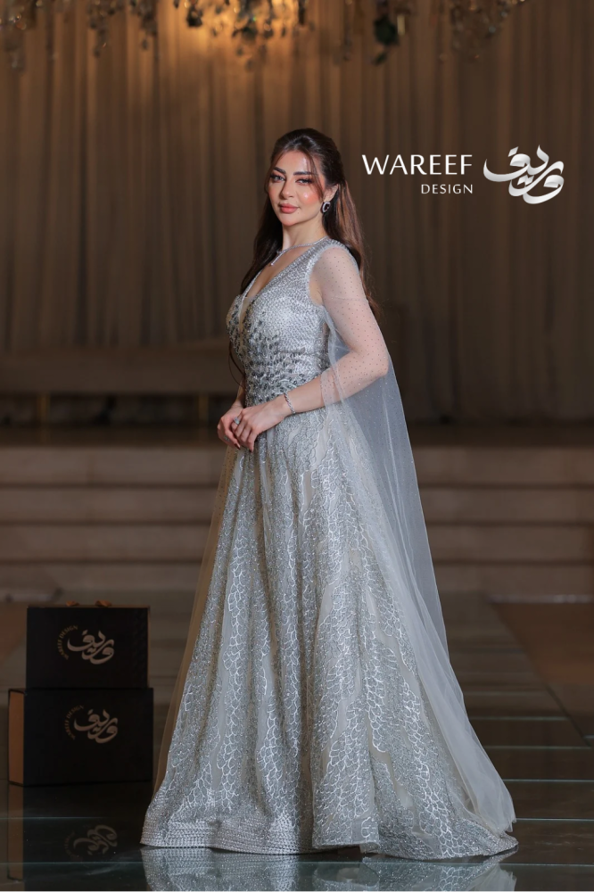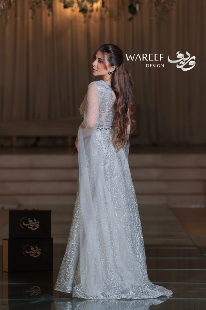 • تفاصيل استثنائية: يزدان الفستان بالكامل بقماش دانتيل فاخر مطرز بخيوط لامعة وتطريزات دقيقة، مما يجعله قطعة فنية متكاملة ومثالية ضمن مجموعة فساتين سواريه فضي.