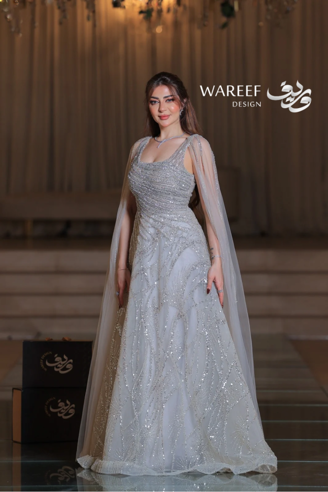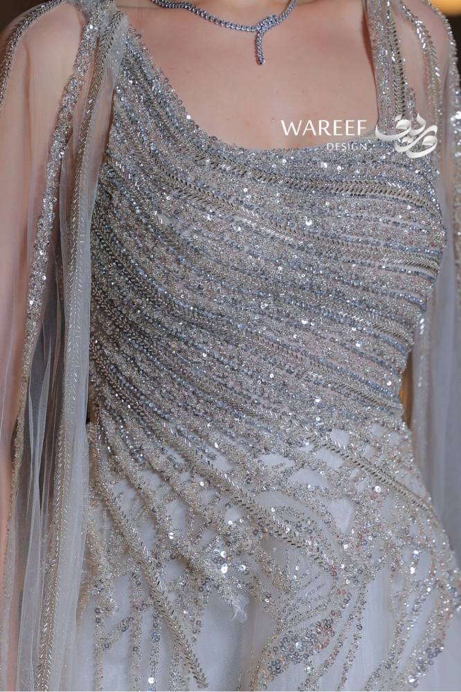 - اللون والتصميم: فضي لامع ببريق يخطف الأنظار، مزين بتطريز متقاطع ومتقن يغطي كامل الفستان ويضفي عليه عمقاً وفخامة. يتميز بقصته الانسيابية الراقية، مع فتحة رقبة دائرية أنيقة، وتصميم أكمام كاب طويلة وشفافة تضفي لمسة ملكية.