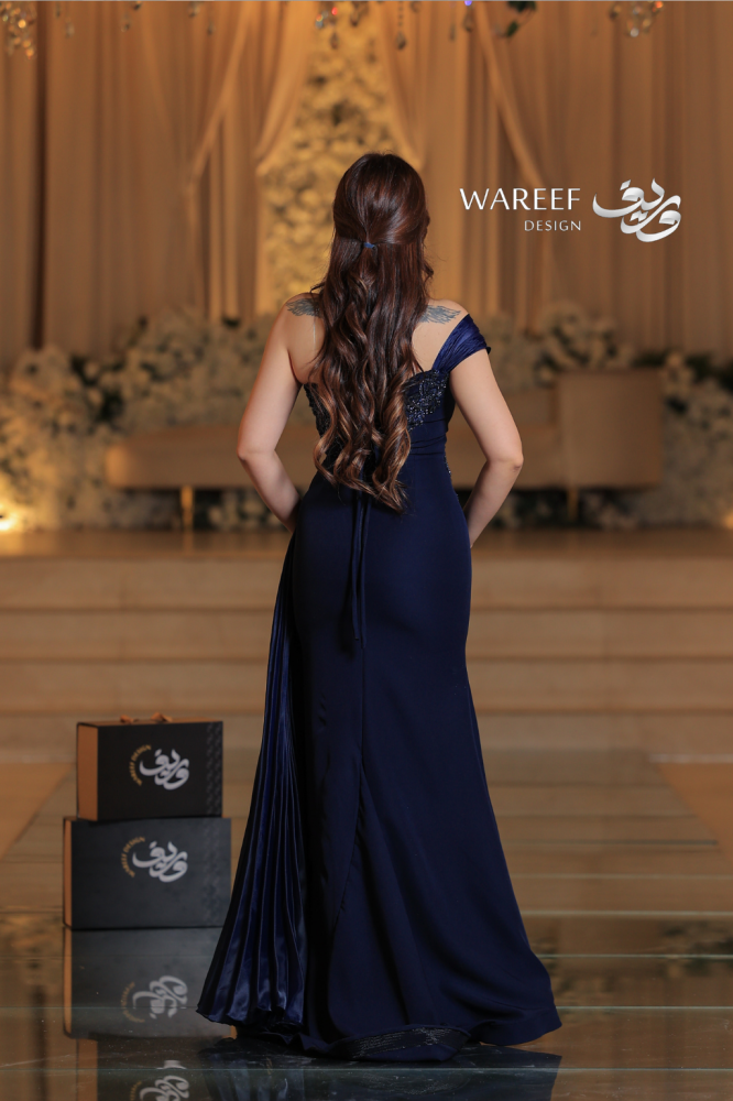 فستان سهرة أنيق بتصميم راقٍ يجمع بين الجرأة والفخامة، يمنح حضورًا ملوكيًا لا يُنسى. التفاصيل الدقيقة فيه تعكس ذوقًا راقيًا وأناقة